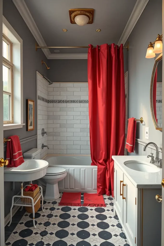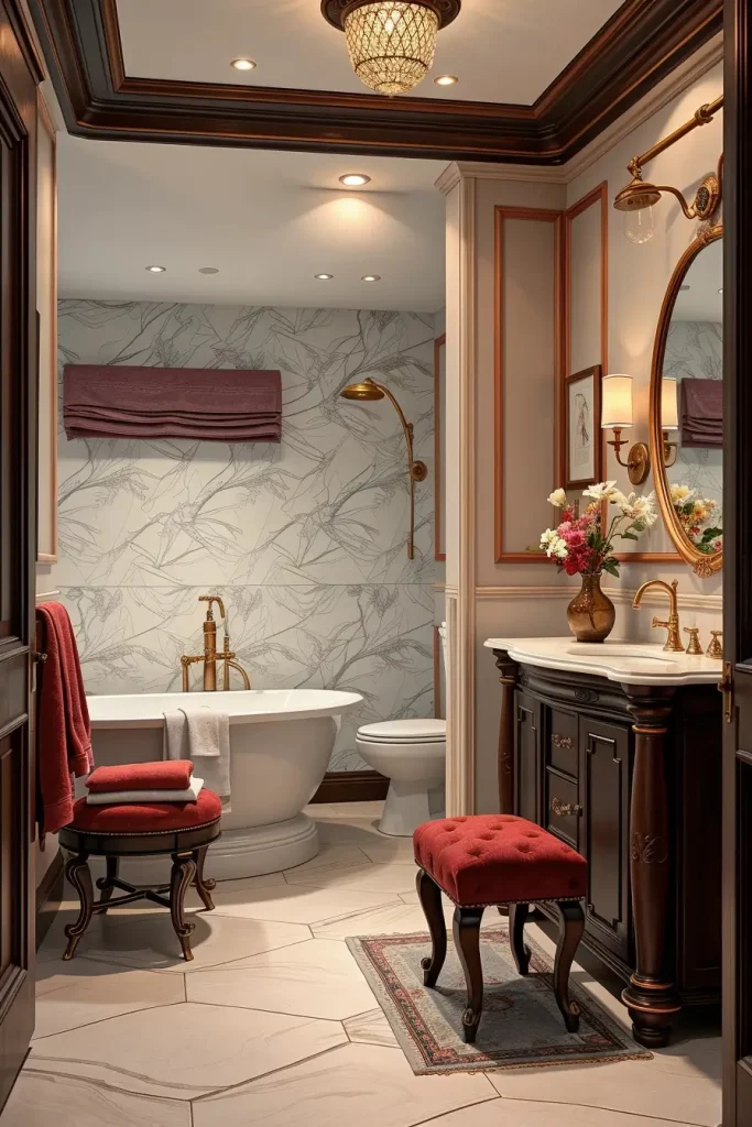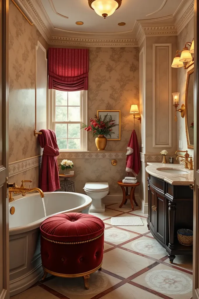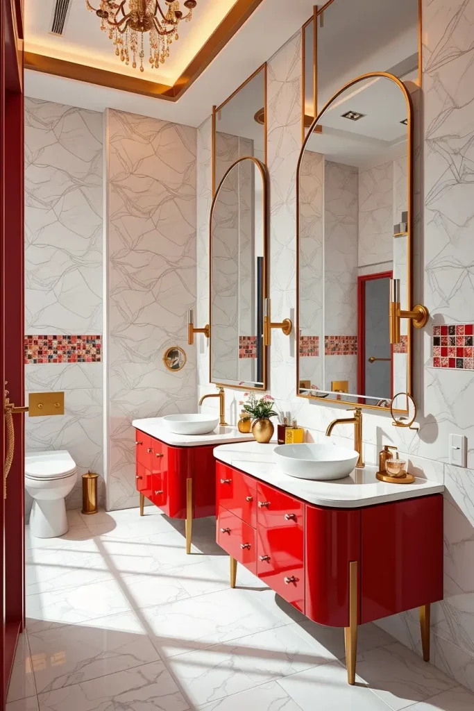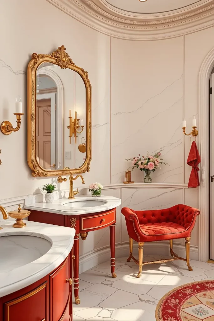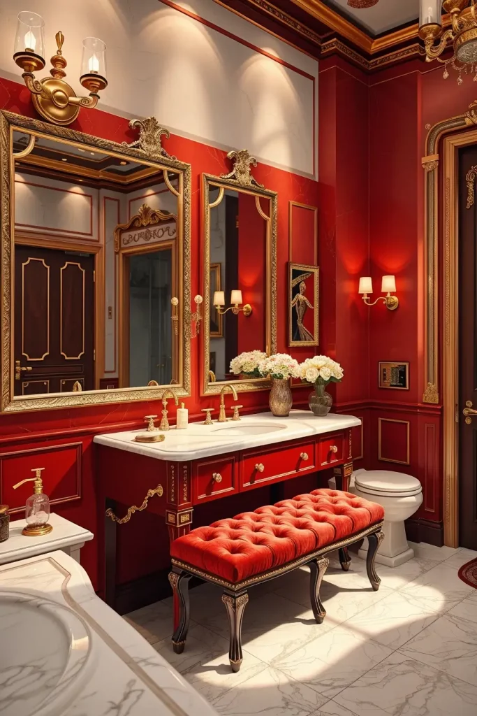 When I am thinking red, I normally begin with red vanity or red tile and add on gold with fixtures, lighting and reflectors. As an example, crimson backsplash with the use of gold sconces and gold-framed mirror construct a royal accent. I do not overdo the accessories, exquisite lines and well-chosen details are the clues to simplicity though not the lack of it. The bench with tufts in velvet red, gold-colored drawer pulls, and a soft white carped rug can bring a feeling of luxury to the place.