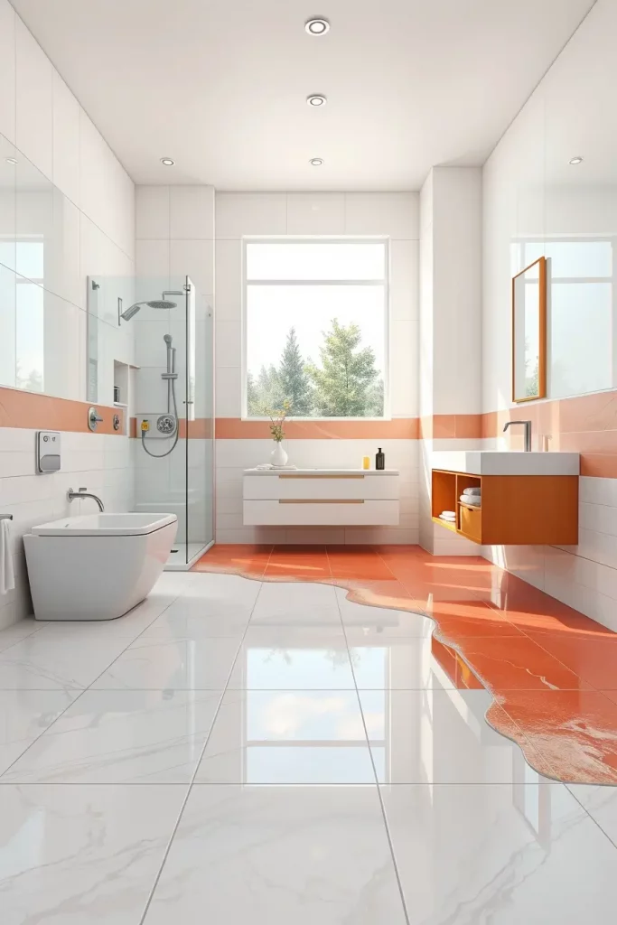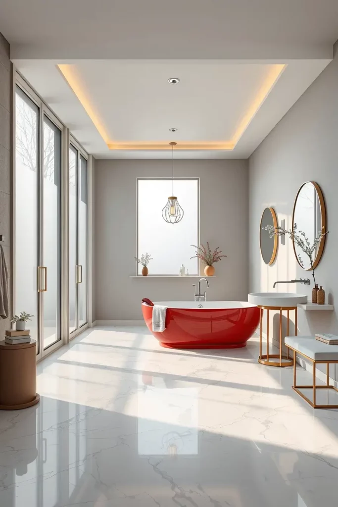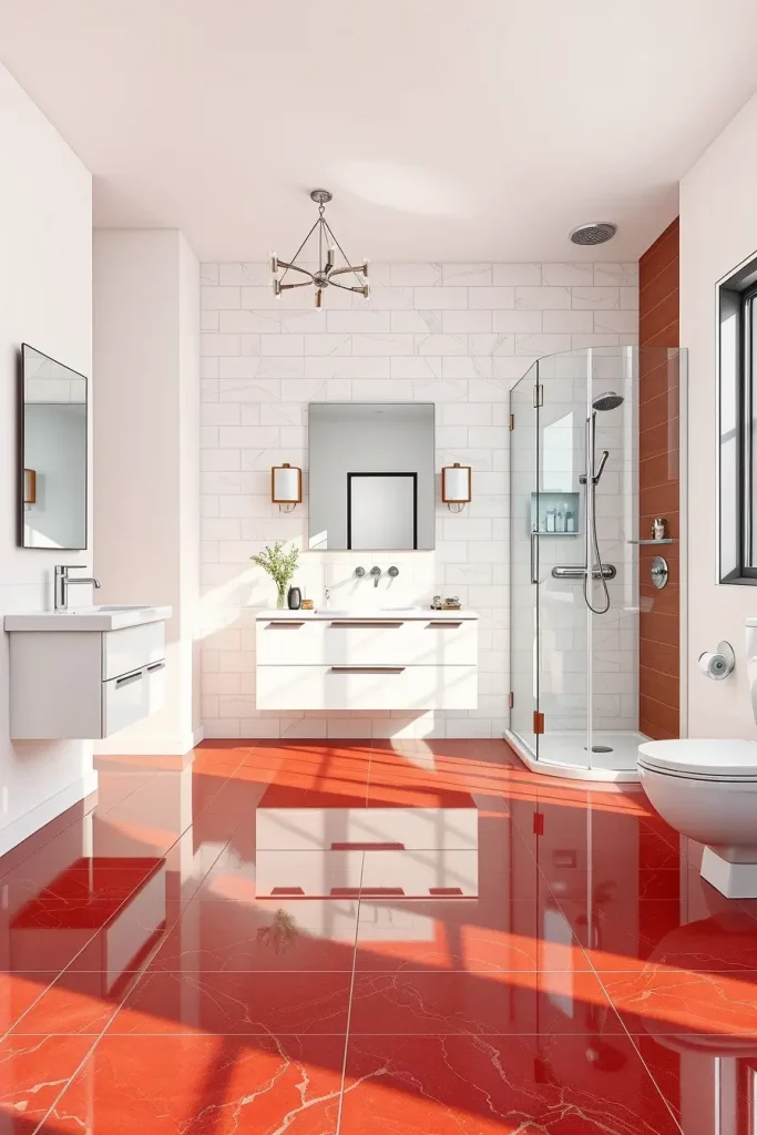 If you’re looking to make a strong statement, glossy red floor tiles are an unforgettable choice. I have applied them in several modern day bathrooms where we wanted to change the agenda of doing the opposite- putting the boldest somewhere else not on the walls. The finding is surprising and flashy. High-glos finishes are also useful in highlighting light and can also ensure that the room seems much bigger and lively.