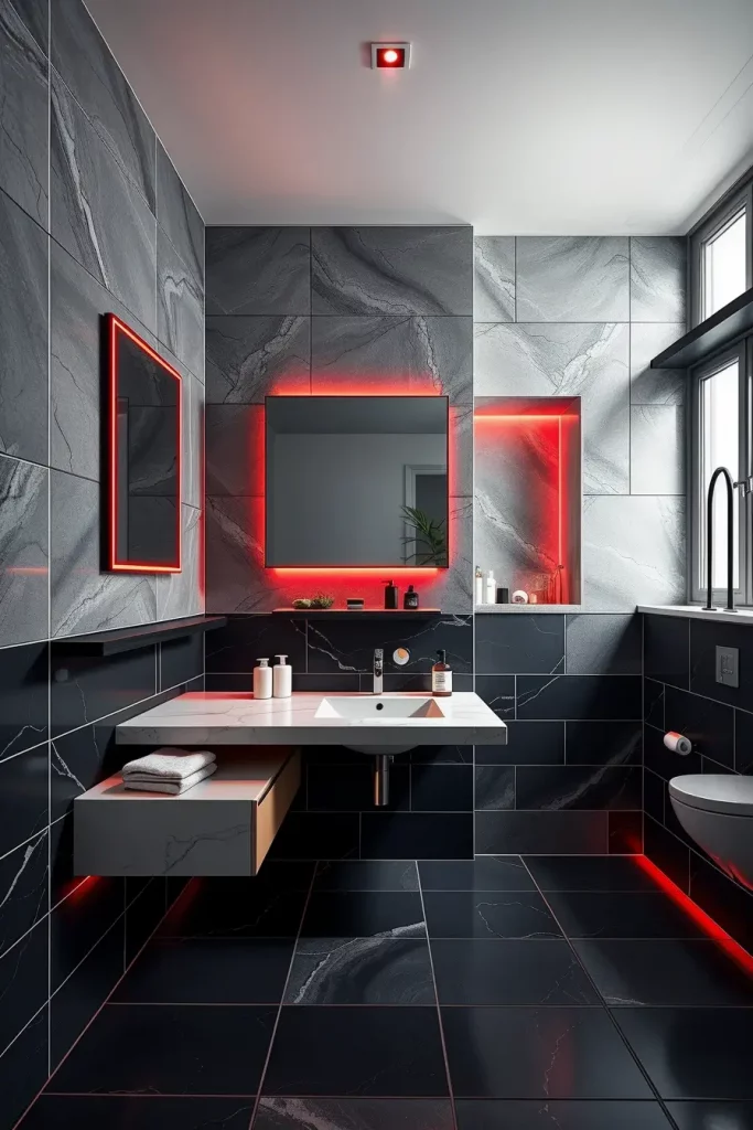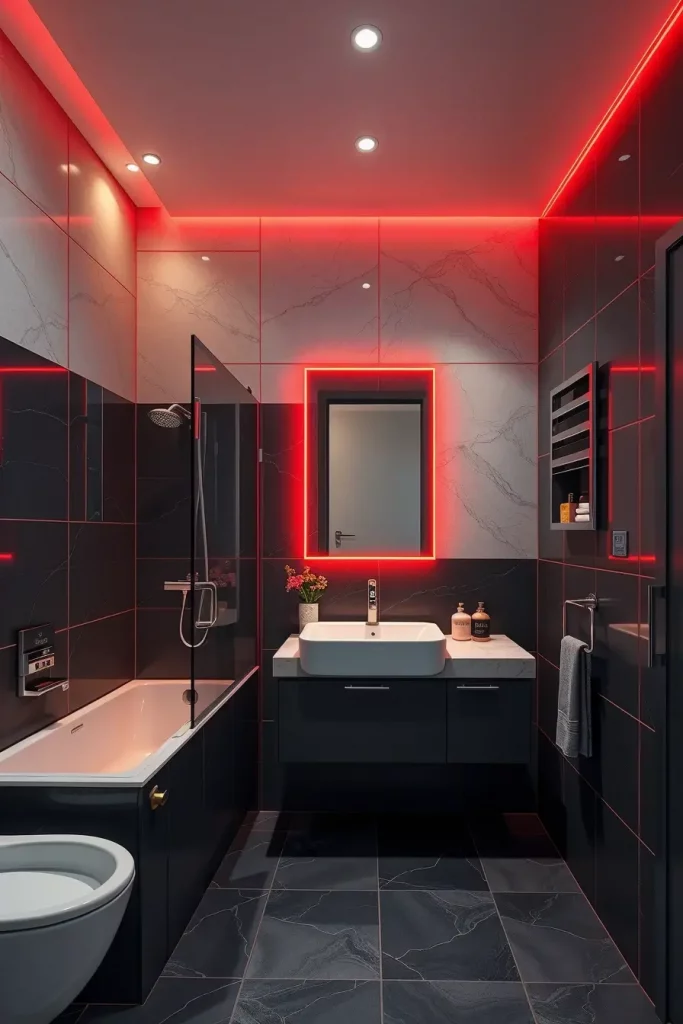 I have discovered that application of red LED lighting is quite the best option to bring out the drama and concentration in a contemporary bathroom. I usually prescribe this method to those customers who desire to have their environment look classy but do not wish to commit to it permanently. One can integrate LED strips under floating vanity, embedded in mirrors or placed in the shower niches to spotlight the space and give a sense of dimension. Red light is also very warm and edgy, which is a bonus in monochrome or gray-toned bathrooms.