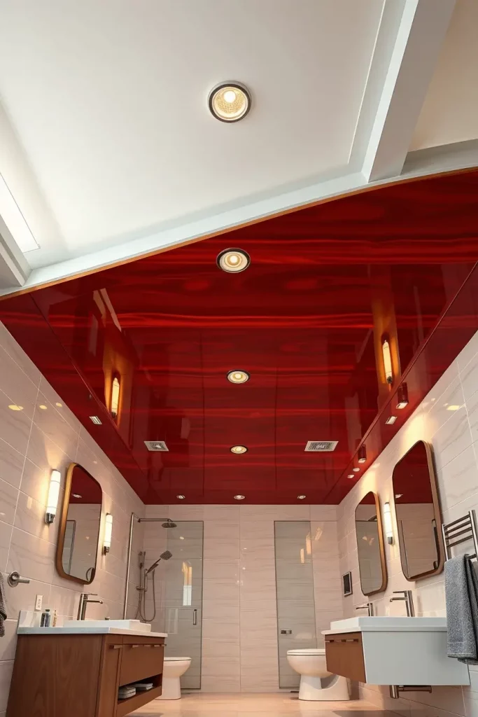It is necessary to utilize the light reflective finish, in this case, high-gloss or lacquered cherry. But instead of creating any kind of visual chaos, I usually will bring the ceiling to one of the small accents in the room: such as a trim or a piece of art. In this case, lightweight PVC or composite panels will work since they resist moisture and easy to install.