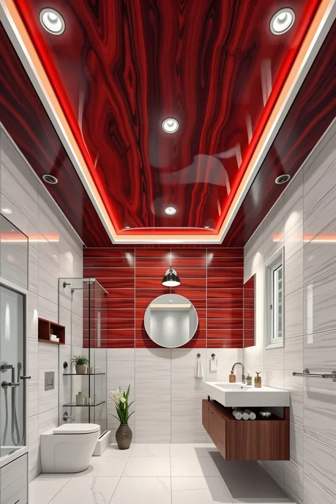 To most, the ceiling never comes to mind when they think of bathroom planning but I think it is the secret weapon. Recently I changed the powder room, which was very dull with some panels of ceiling of cherry color and it made the atmosphere very different. This daring decorative decision directs the eyes towards the ceiling, and it makes the space look more taller and fancy.