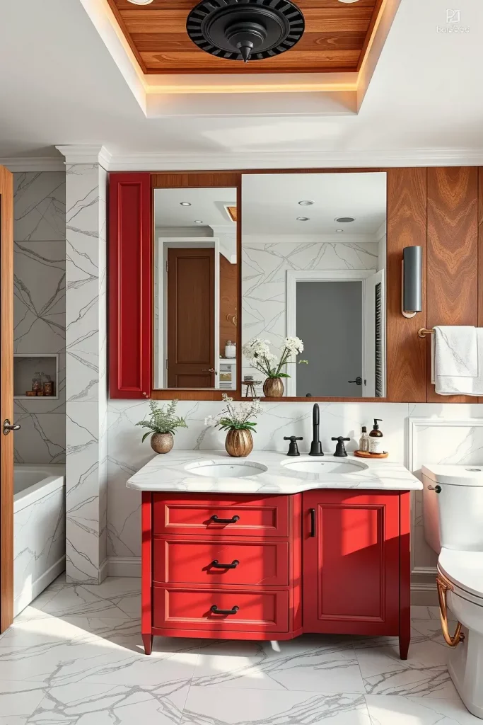 Red accent and wood textures are a classic combination of adding both the warmth and the sophistication to your bathroom. I have used this combination especially in how I have furnished my bathrooms that appreciate the homey but sophisticated atmosphere. Natural wood colors as in vanities, shelving or even ceilings can be a lovely match to the intensity of red and also serve to connect the color palette with nature.