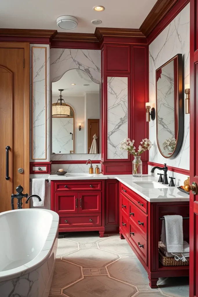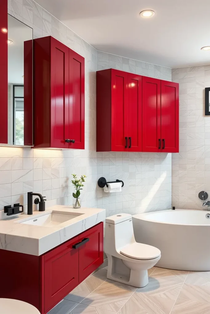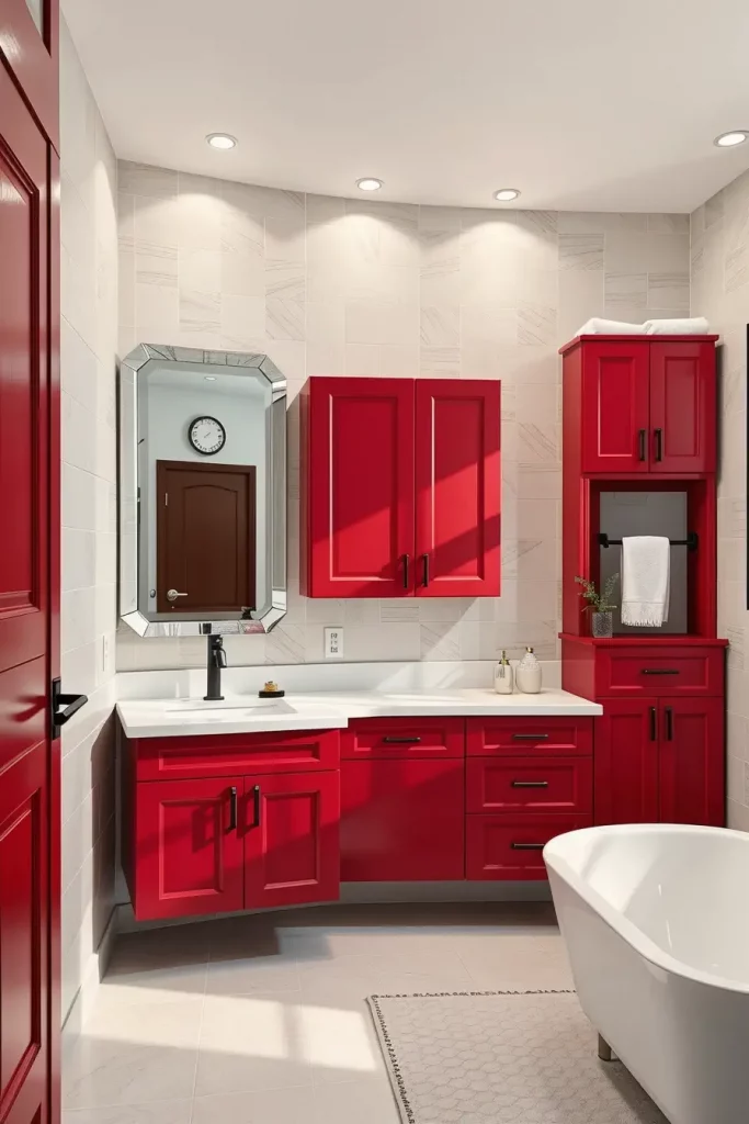 Storage doesn’t have to be boring, and ruby red cabinets are proof of that. I am a fan of bold cabinetry in a bathroom because it adds some color and drama. Red cabinets immediately attract attention and make a focal point in the room. Choosing between a matte and high-gloss red, one will still be able to get the benefits of personality and a clean room. It works particularly well within modern or transitional design purposes.