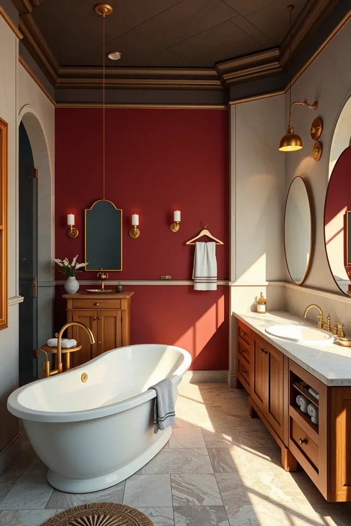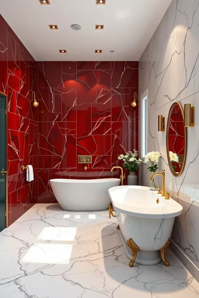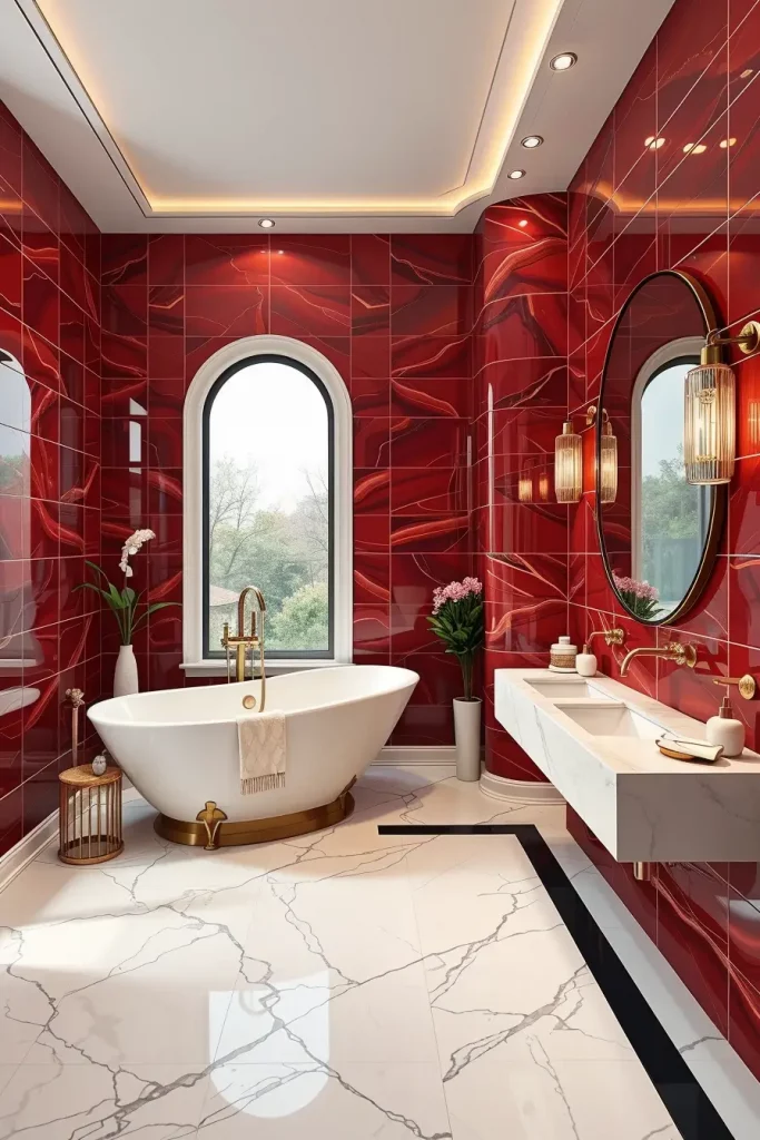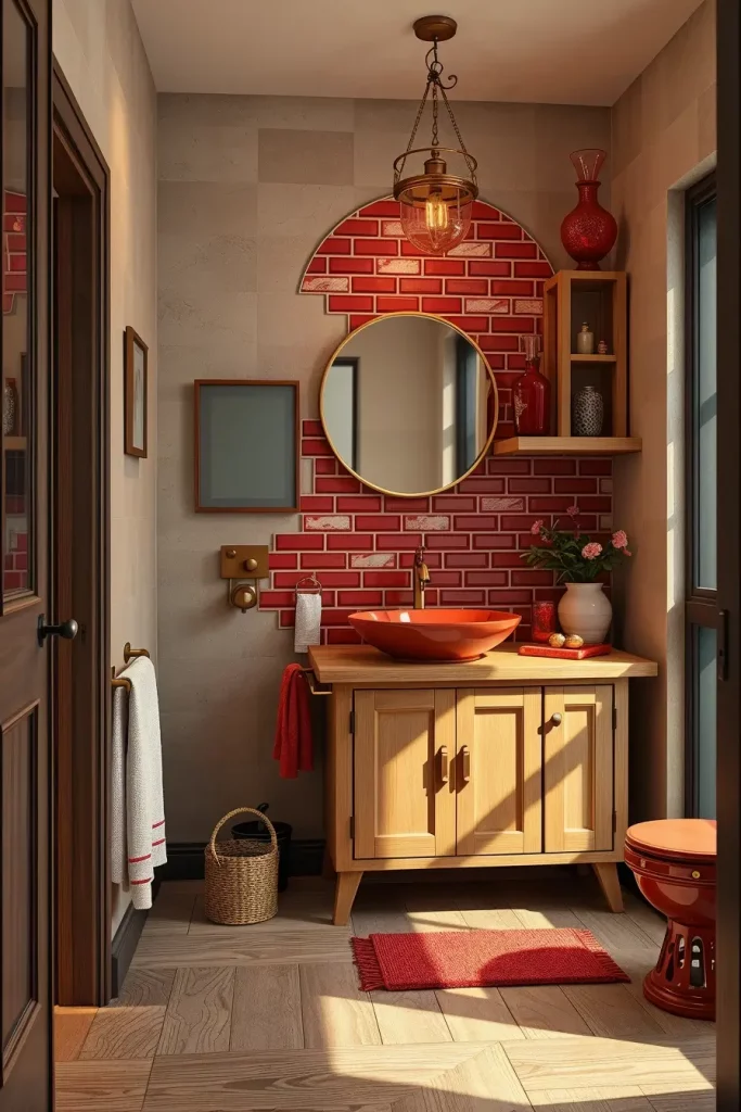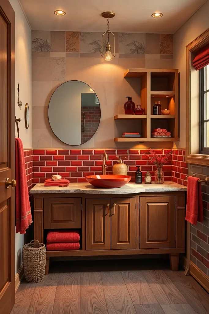 To maintain the look contemporary and roots, I tend to combine red tiles with either black grout or white marble tops. A brass-festooned freestanding tub, set against a red tiled wall, is, as well as brassy, welcoming. I would advise to select tiles that can be easy to clean, are moisture proof; porcelain and ceramic can be generally good in wet areas. The color can also be incorporated quite effectively with a mosaic tile of red behind the sink.