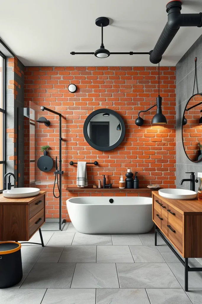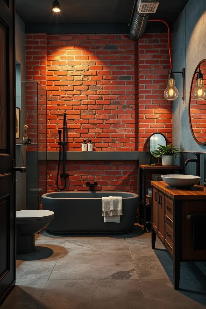 I prefer faux brick tiles or textured porcelain panels in brick red on one of the feature walls, normally behind the vanity or within the shower area. It gives a feel and looks spectacular with shiny concrete floors or matt black fittings. When stacked on top of wood or industrial lighting the atmosphere becomes effortlessly cool.