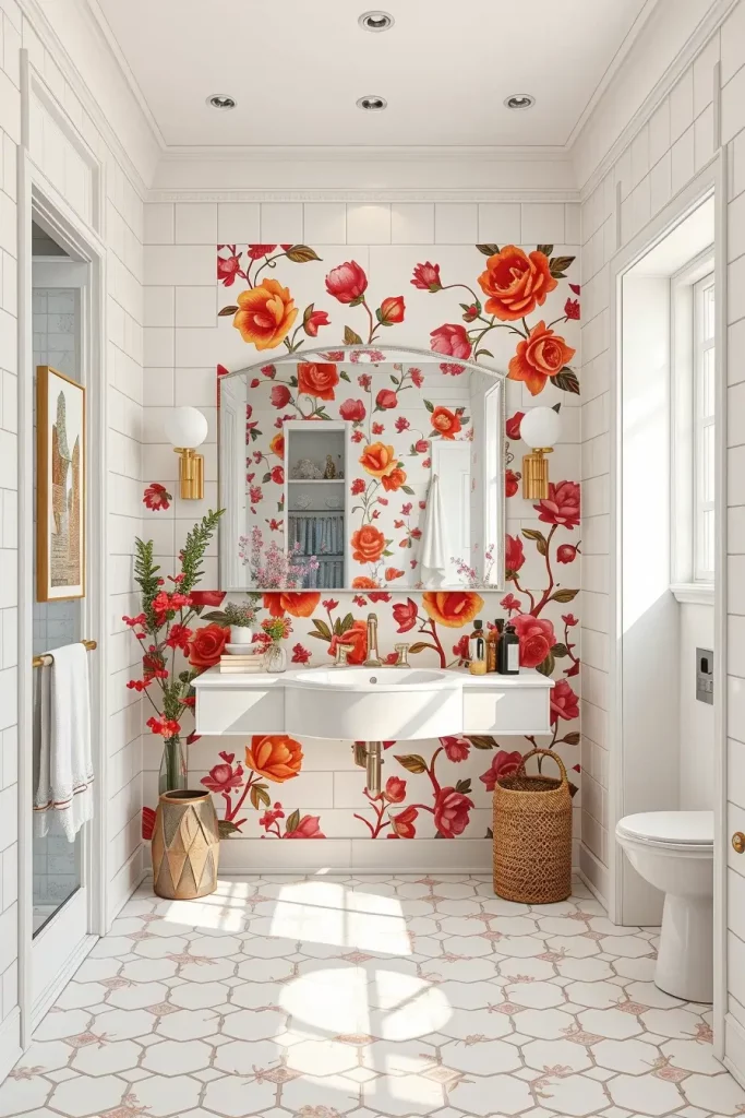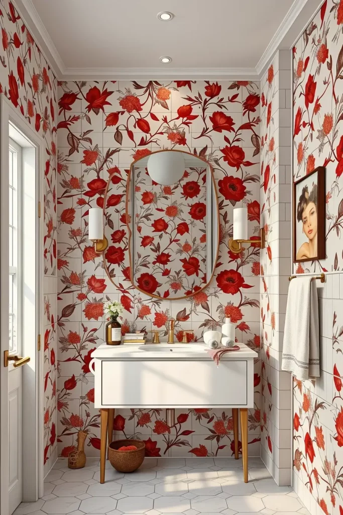 To have a romantic or artistic effect I simply adore employing red floral wallpaper. It is among the more eloquent methods of adding color and pattern and it can turn even small bathrooms into a design statement. Both vintage and new aged red florals always come across as springy and cheerful.