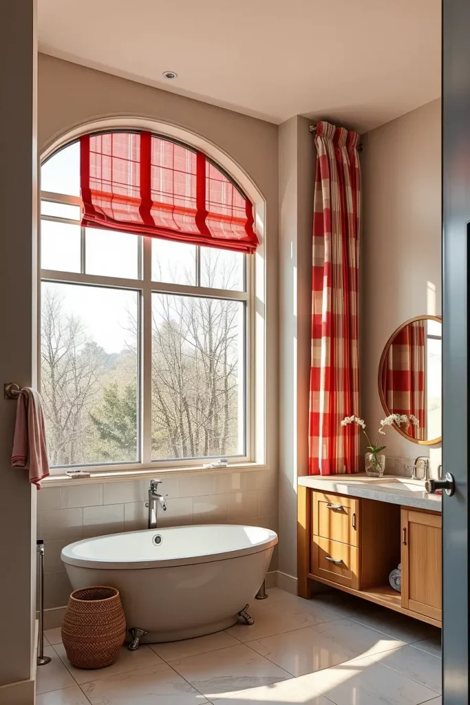 When large or corners windows are on the bathroom, red cloth shades of cotton or linen are applicable to give it a soft and warm appearance. I like it best to leave it alive and to use patterns (red stripes or flower print, for example), but without being too heavy. This burst of red serves as the finishing touch in the areas with black and white palette.