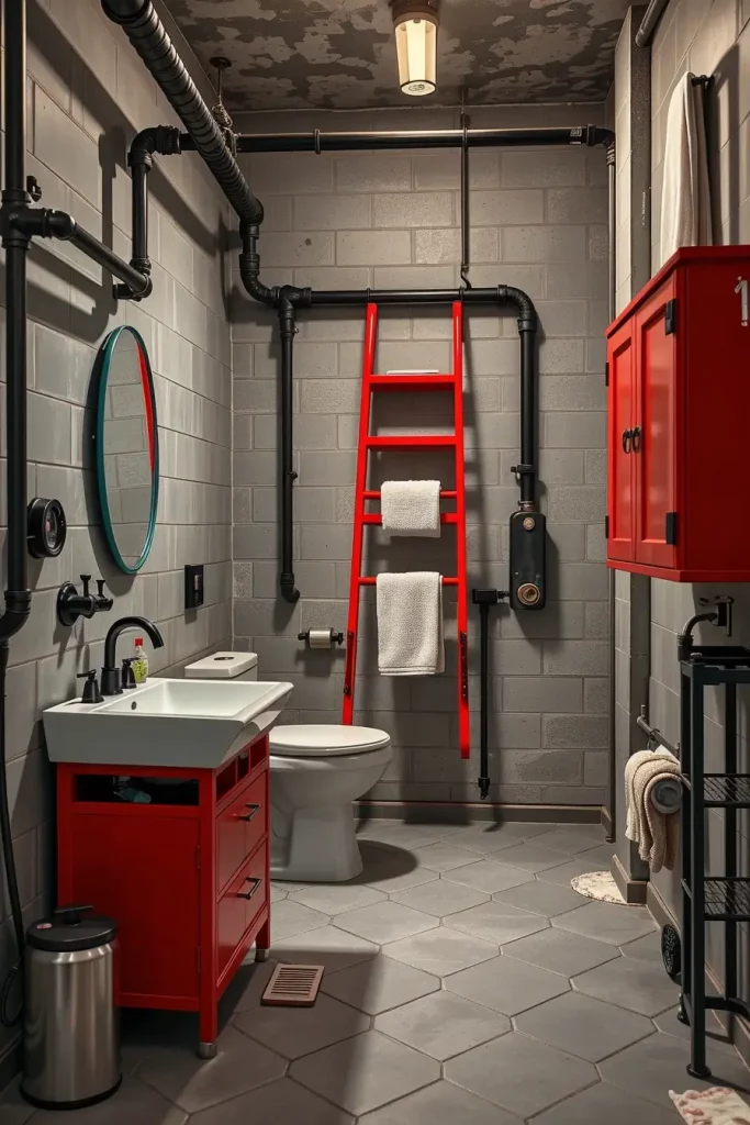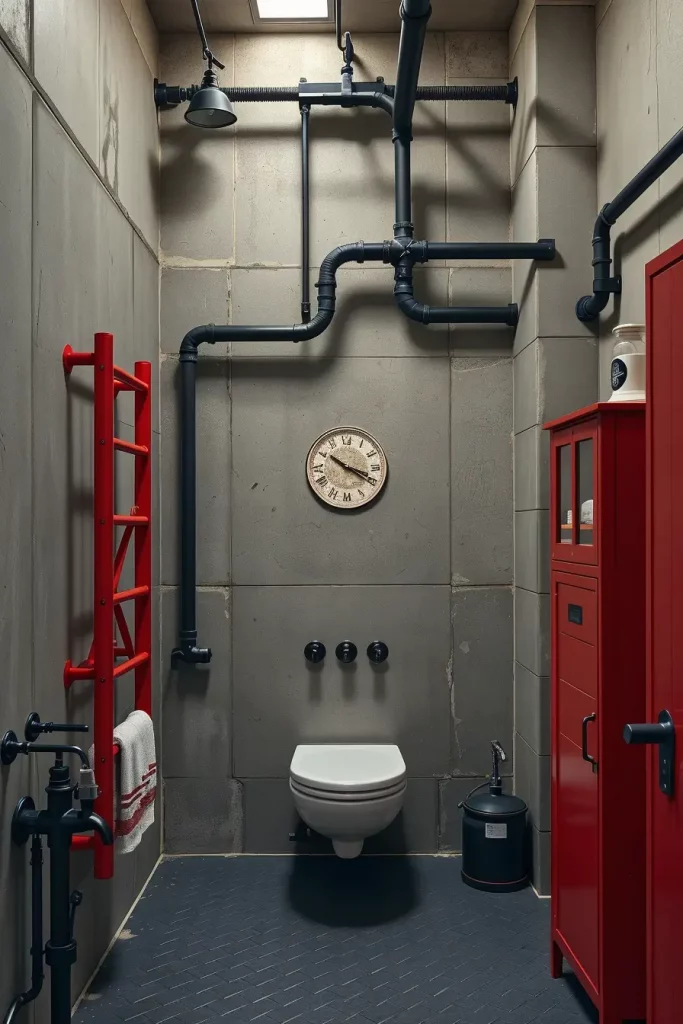 The red color can be used in designing industrial-looking bathrooms to provide a vivid contrast with raw concrete, exposed brick and steel that is used. I also believe that with the red usage in this situation, it creates energy and warmth that would otherwise be a cold-looking, one-colored space.