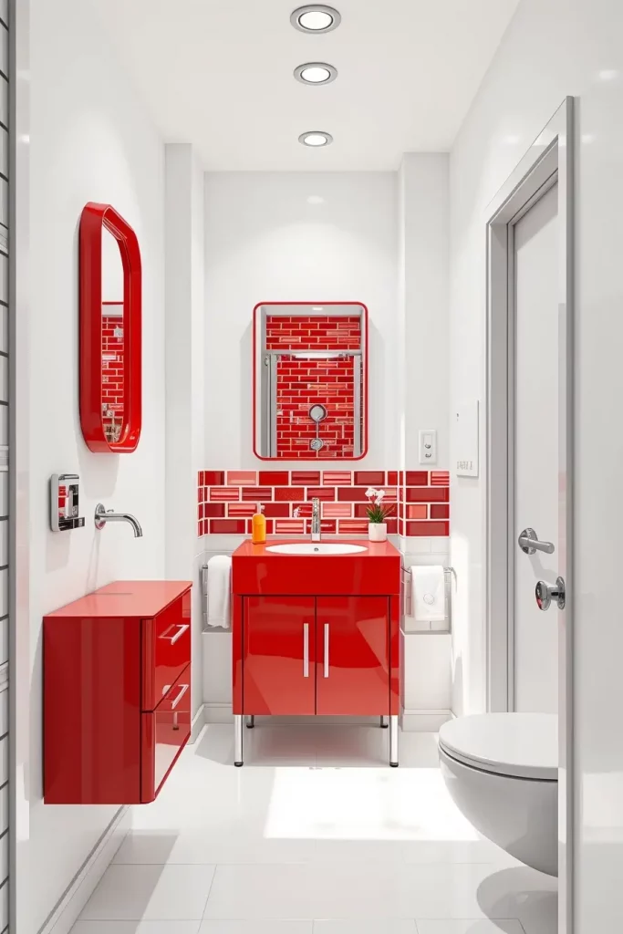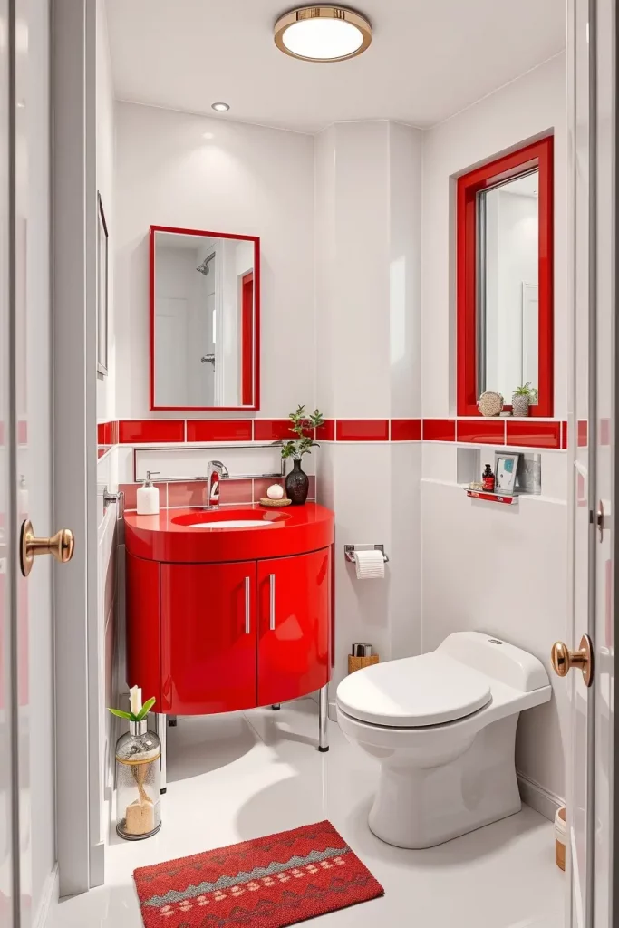 I would recommend to use one or two accents of red and leave the rest of the design better left clean and neutral to make red work in a confined area. A sleek cabinet, with red finish as a vanity cabinet, might suffice by being placed beneath a sleek countertop. You might also like to use red tiles- as a vertical stripe in a shower, or as a frame to a mirror. Cerebral cat eyed glass and glossy red subway tiles as a half-wall treatment introduces drama and reflects light making the room look brighter and larger.