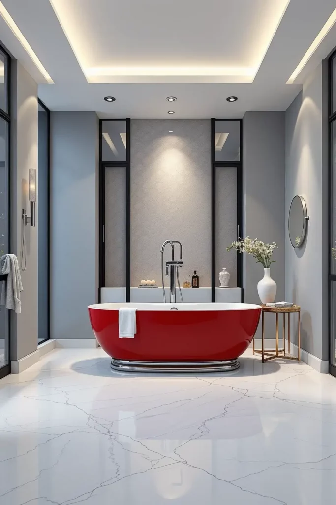 A more dressed up touch I adore is red accents and metallic finishes, especially brushed gold, matte black or polished chrome. The red color is warm, and metals serve as a contrast to this setting and provide a polished accent. The combination blends perfectly in modern as well as in-between bathroom designs.