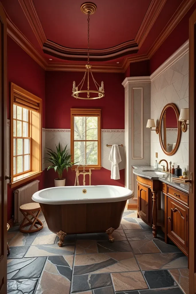 This should be best achieved using matte or satin-finish paint. Another way to add dimension is by using a burgundy wall that is textured. I normally add wood-framed mirrors, dark oak cabinetry and the soft warm lightings to enhance the quality of the redness. These features render the room lux moneyed and yet down to earth.