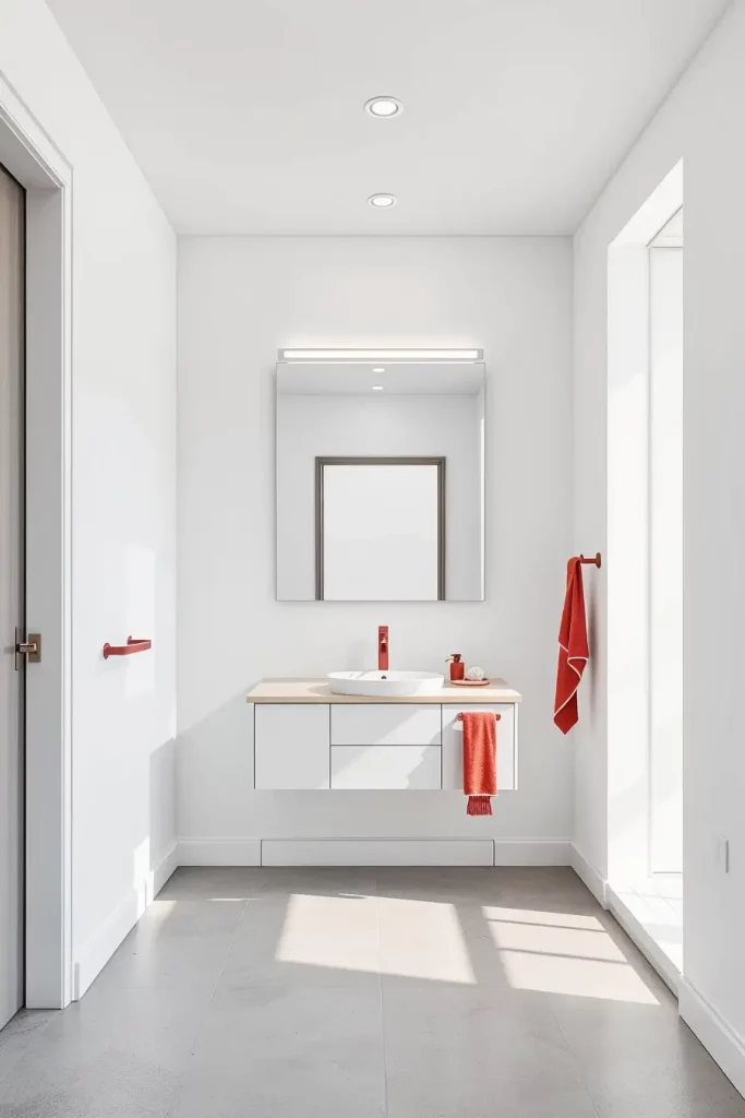 I like to play a trick with modern minimalism but some humming red in the form of fixtures (faucets, towel bars) or even lights. The minimalist way of implantation offers a minimal dose of drama without dominating the entire space. I have watched red fixtures become very trendy and look great in all-white or charcoal bathrooms, where everything is accentuated.