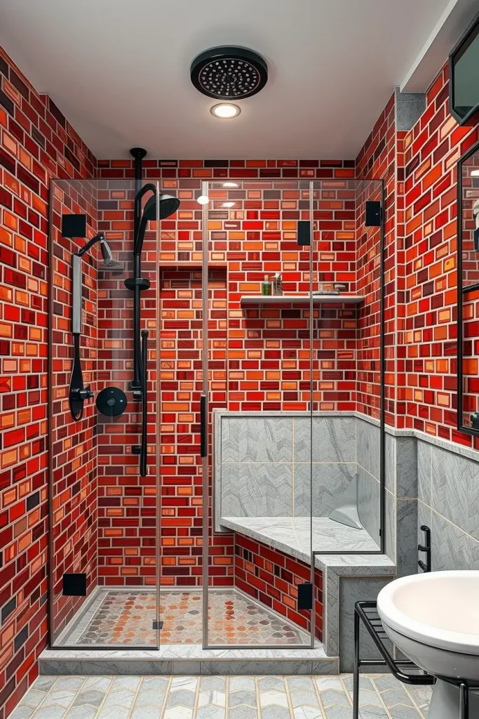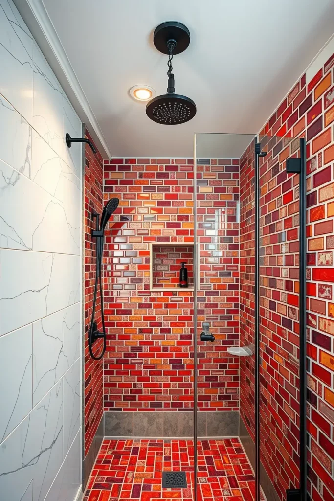 I have liked that red mosaic tiles have the ability of adding texture and color to shower areas. They offer a dynamic visual that larger tiles often can’t, creating intricate detail and a splash of personality. I prefer to have red mosaics all over a shower enclosure or, as a vertical band on the floor to ceiling strip. It contributes to architectural interest and makes the space characterized by a fashionable, personal touch.
