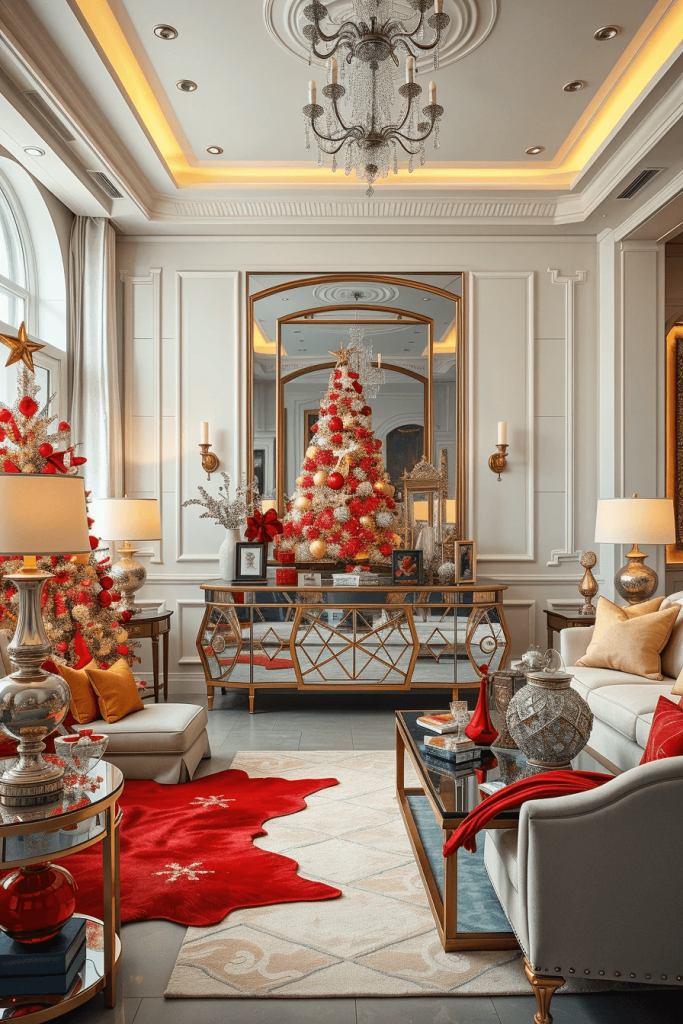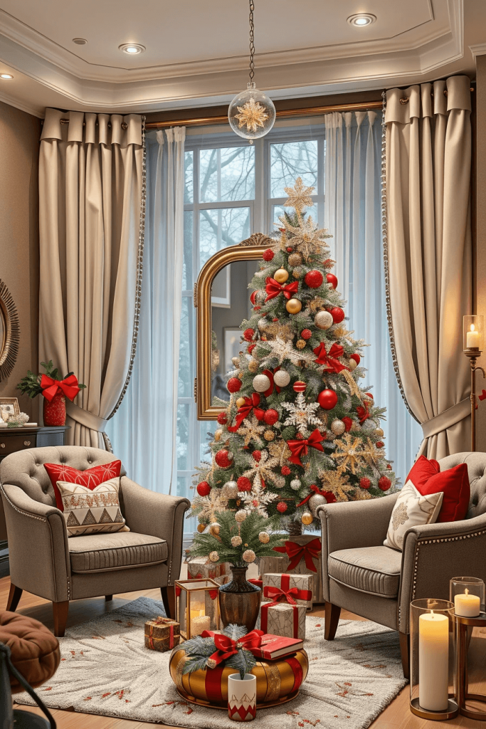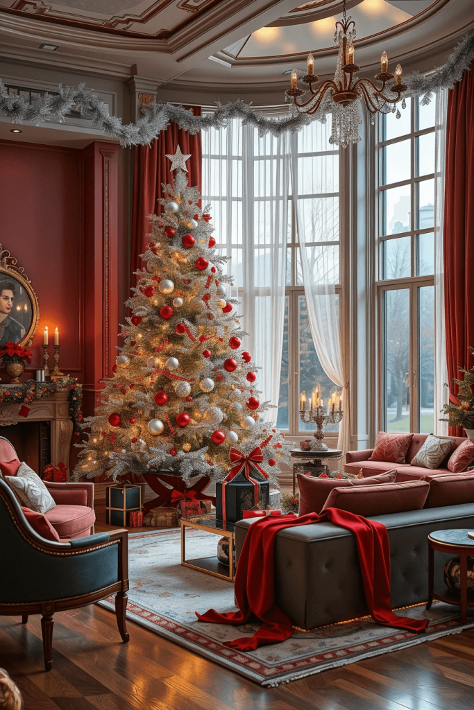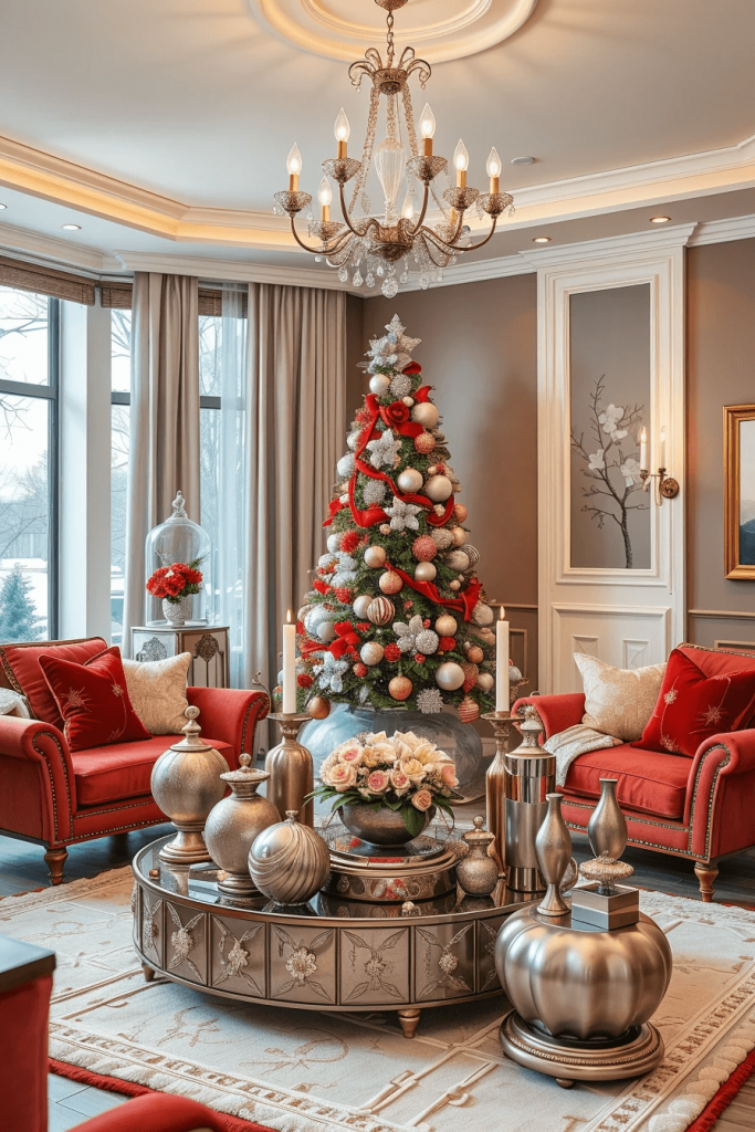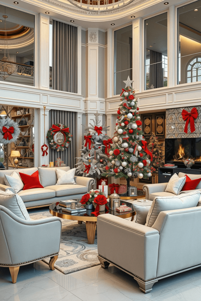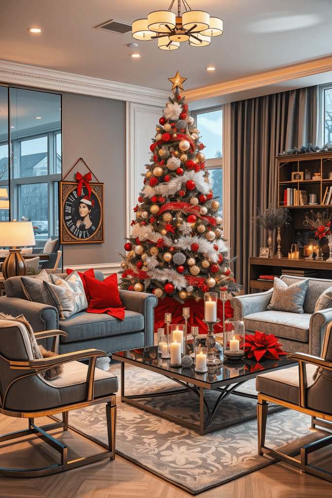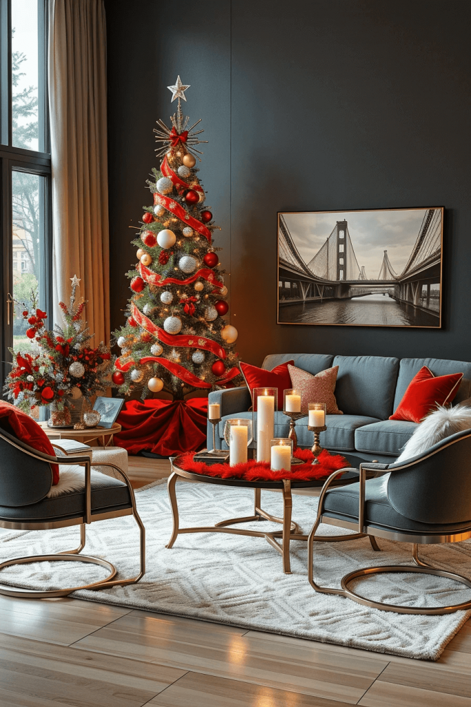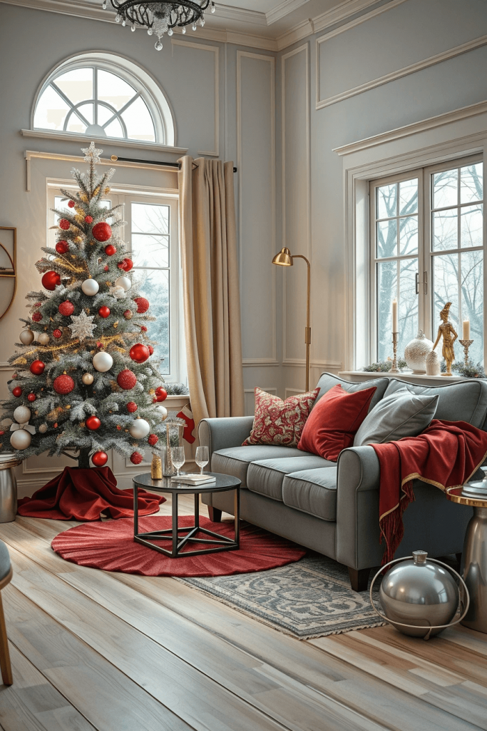 In the case of furniture, I choose neutral bases, i.e., gray or white sofas, light wooden floor, and mirrored surfaces. The accentual elements may be red throws or curtains and other elements and silver wall art or side tables may be used to balance the metallic colors of the decorations. The look is finished with a statement chandelier or modern floor lamp which reflects the shininess of the tree.