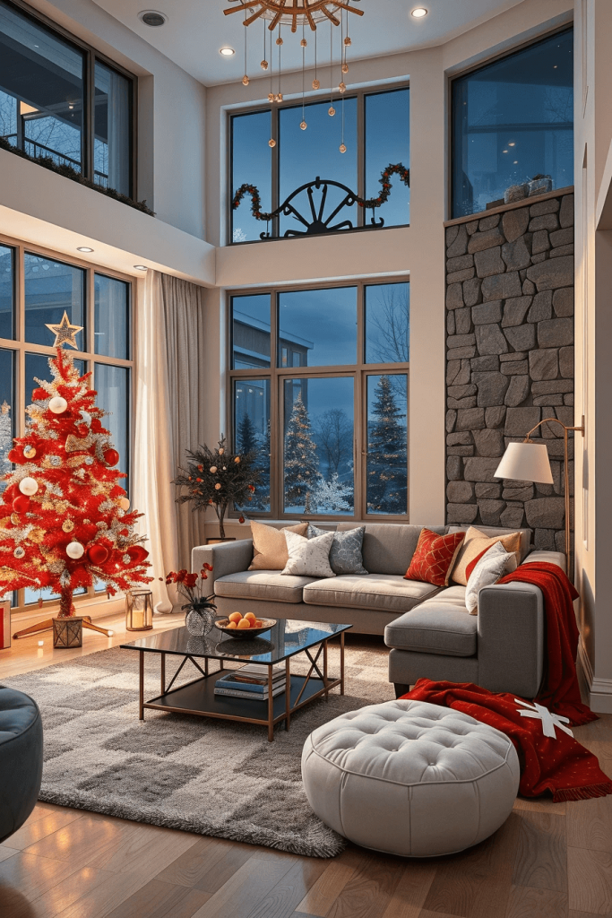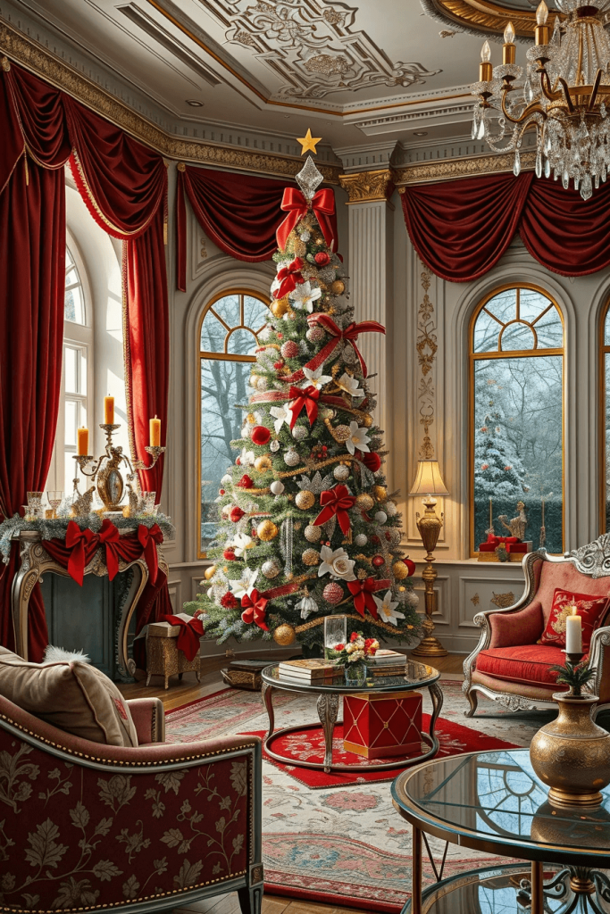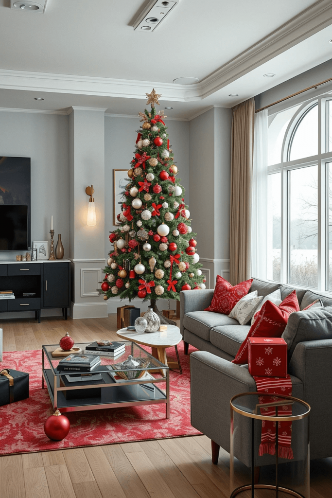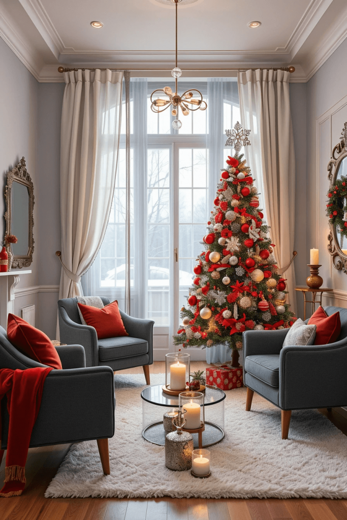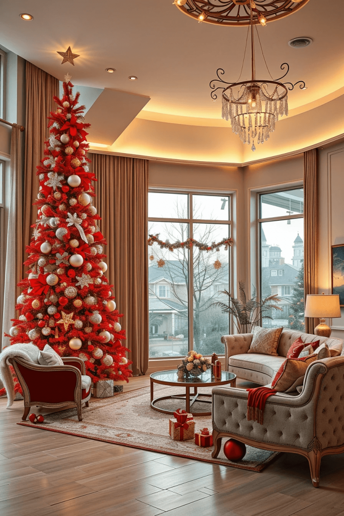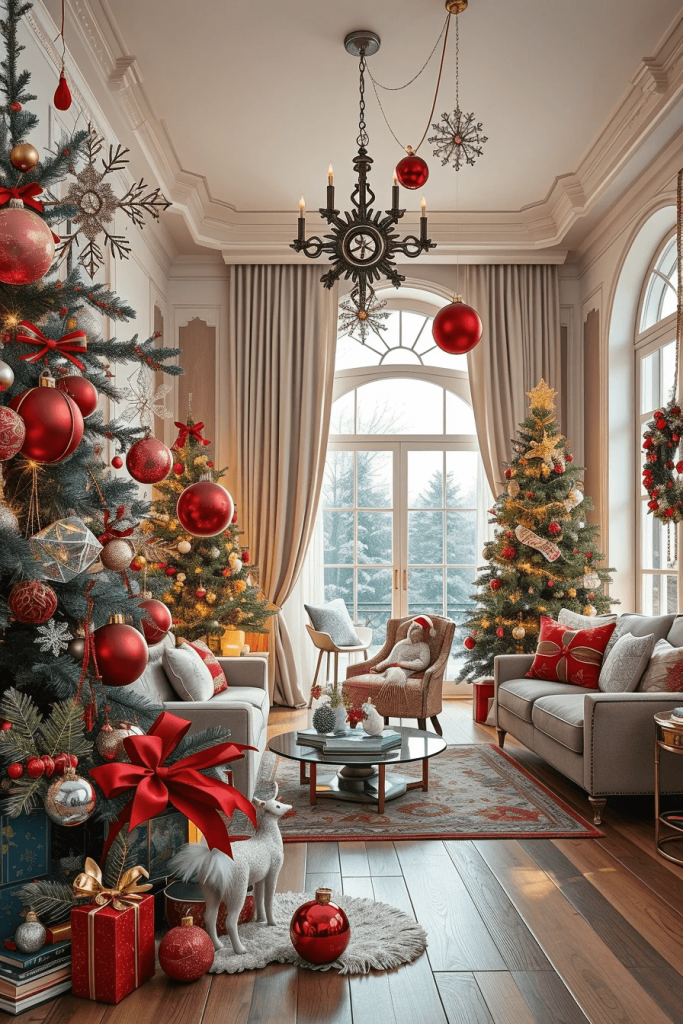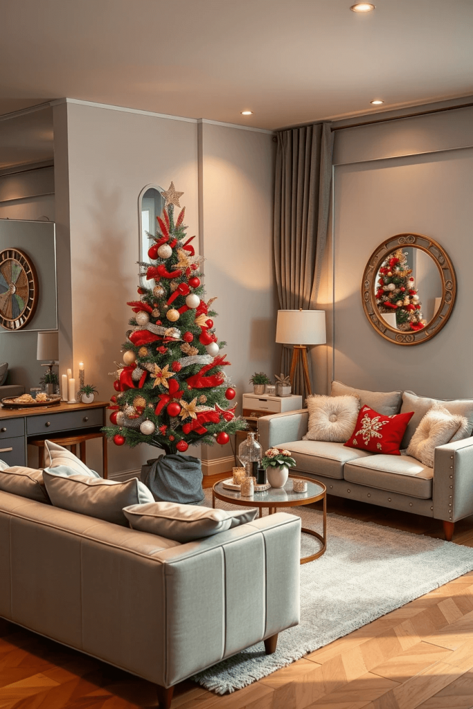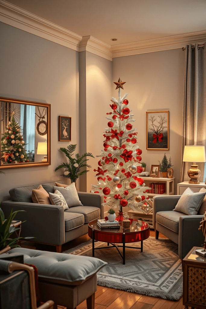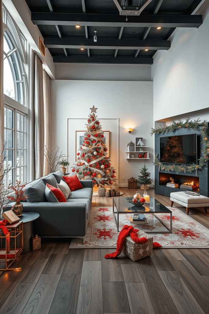 In the case of furniture, I choose neutral bases, i.e., gray or white sofas, light wooden floor, and mirrored surfaces. The accentual elements may be red throws or curtains and other elements and silver wall art or side tables may be used to balance the metallic colors of the decorations. The look is finished with a statement chandelier or modern floor lamp which reflects the shininess of the tree.