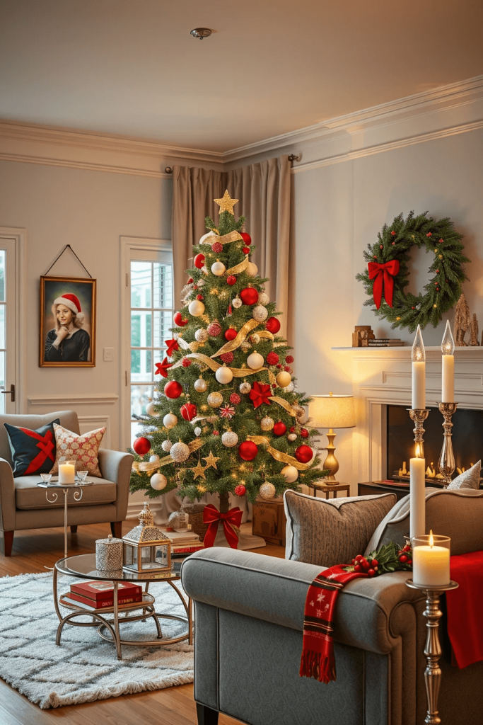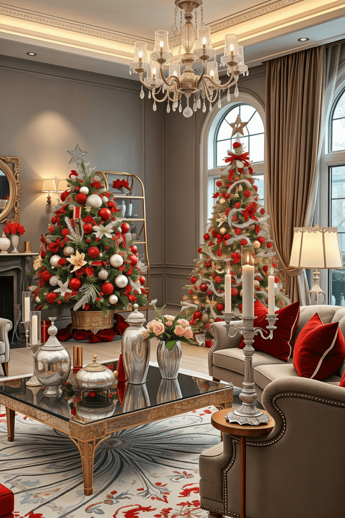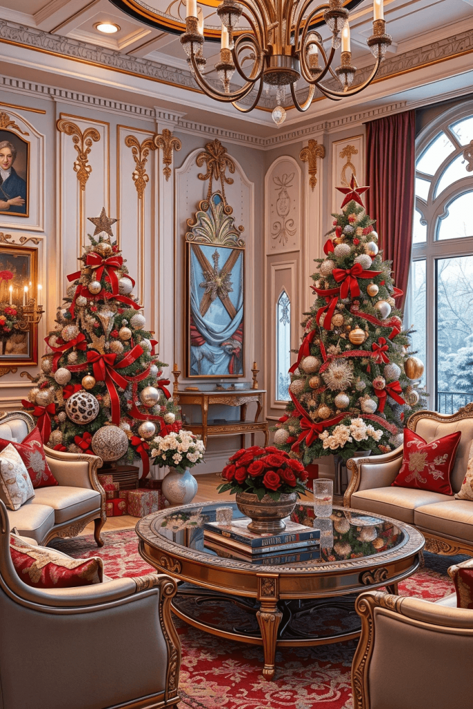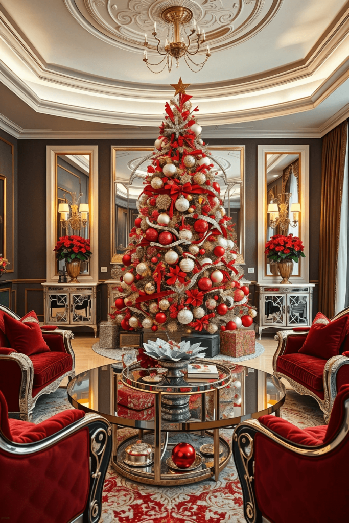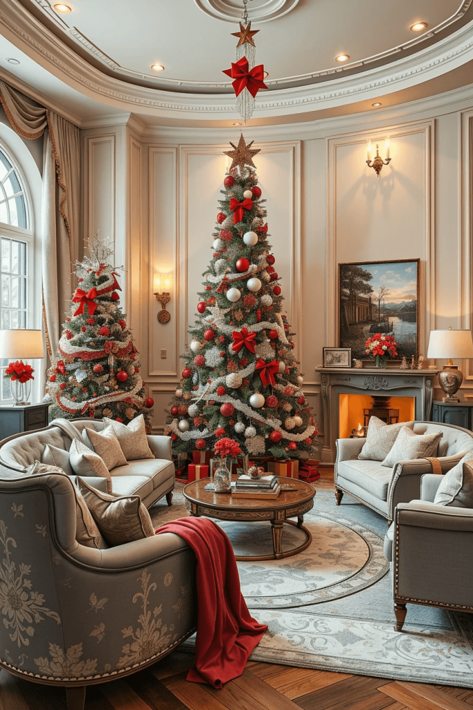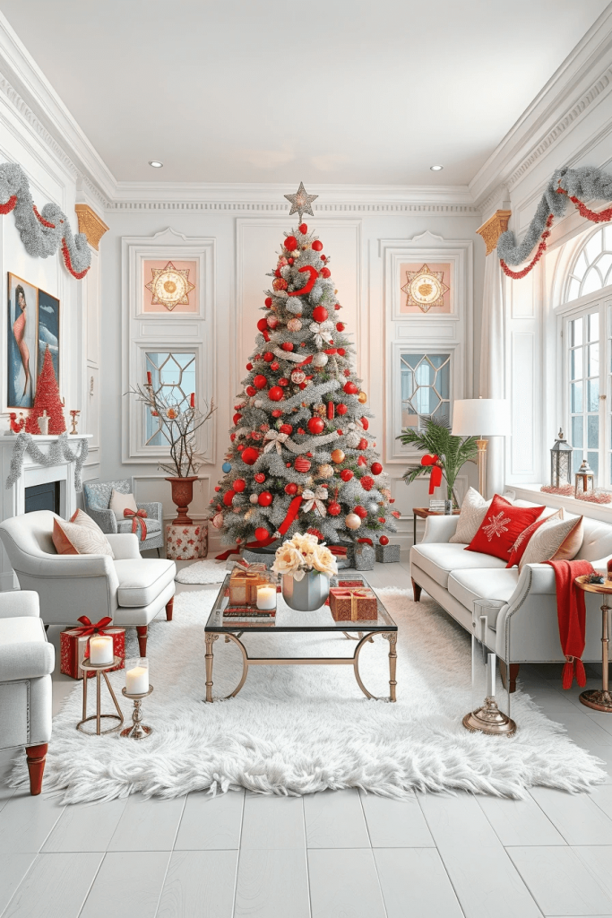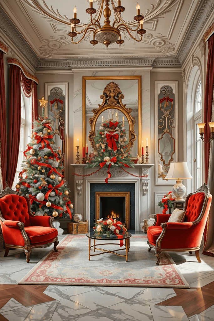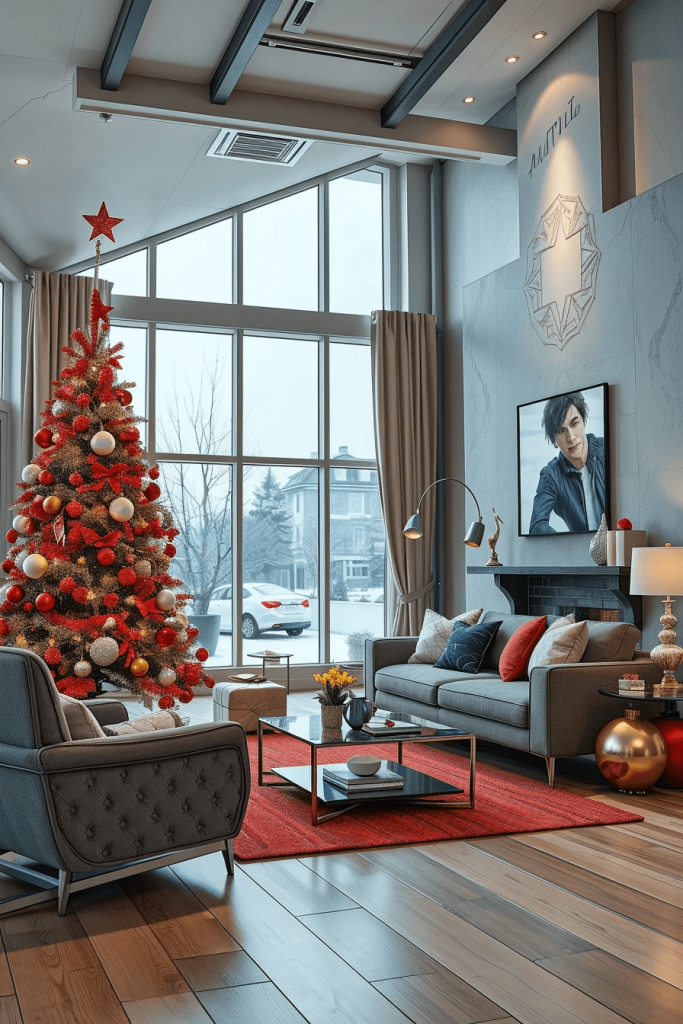 In the case of furniture, I choose neutral bases, i.e., gray or white sofas, light wooden floor, and mirrored surfaces. The accentual elements may be red throws or curtains and other elements and silver wall art or side tables may be used to balance the metallic colors of the decorations. The look is finished with a statement chandelier or modern floor lamp which reflects the shininess of the tree.