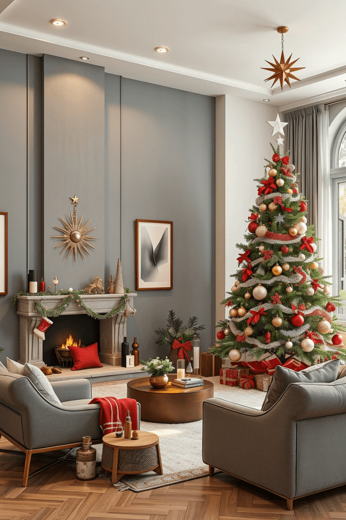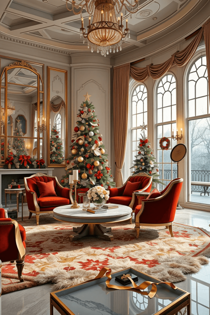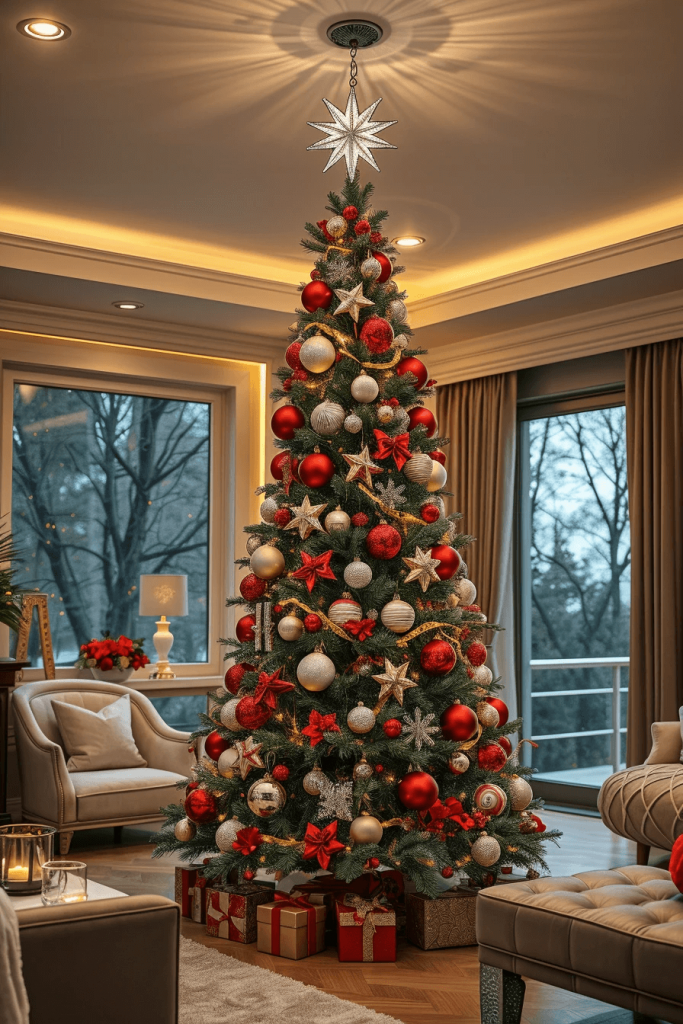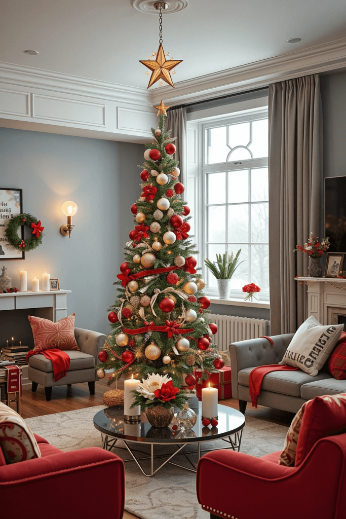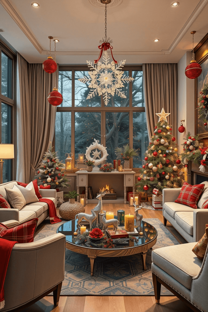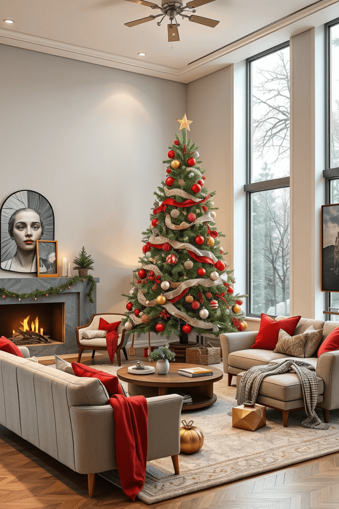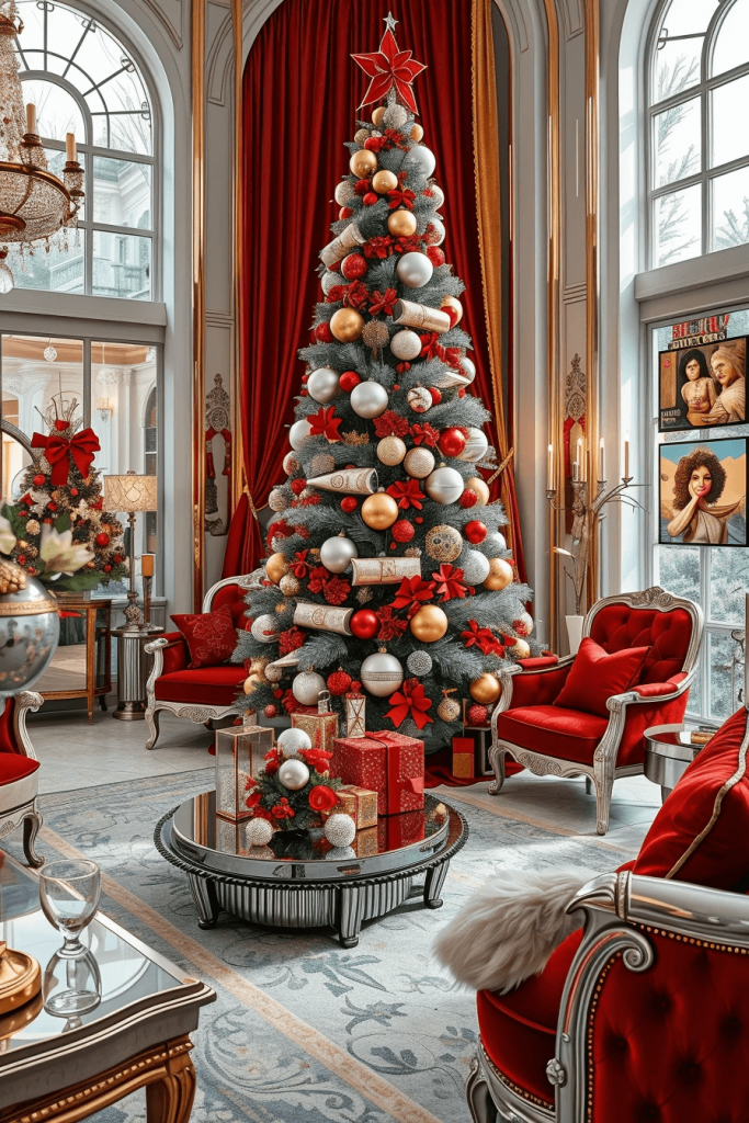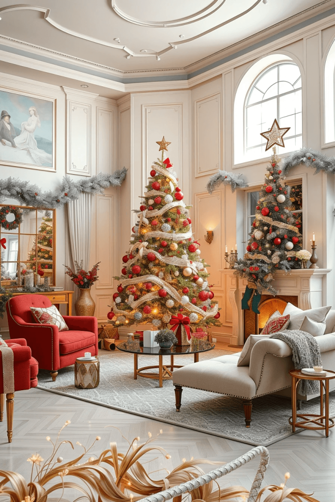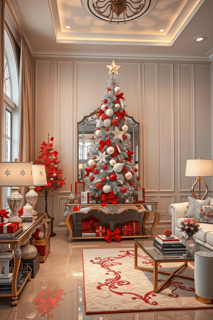 In the case of furniture, I choose neutral bases, i.e., gray or white sofas, light wooden floor, and mirrored surfaces. The accentual elements may be red throws or curtains and other elements and silver wall art or side tables may be used to balance the metallic colors of the decorations. The look is finished with a statement chandelier or modern floor lamp which reflects the shininess of the tree.