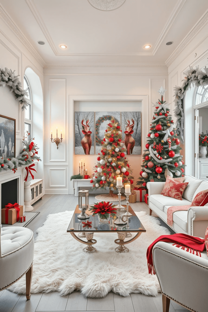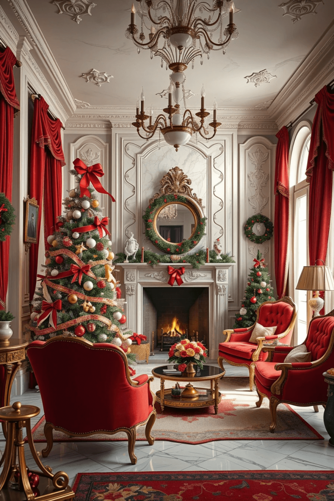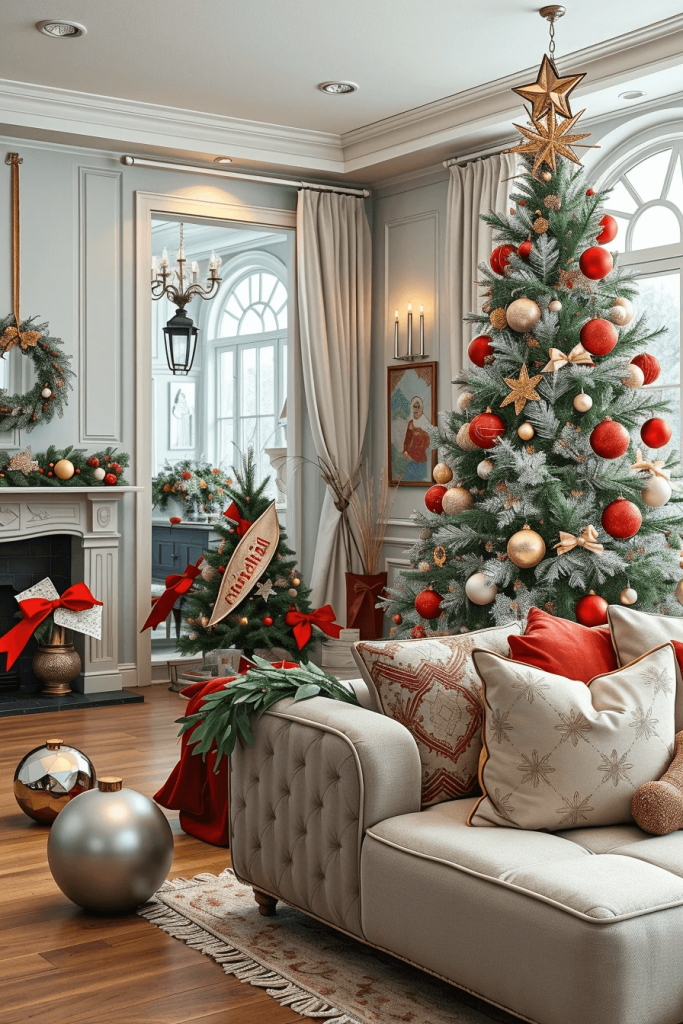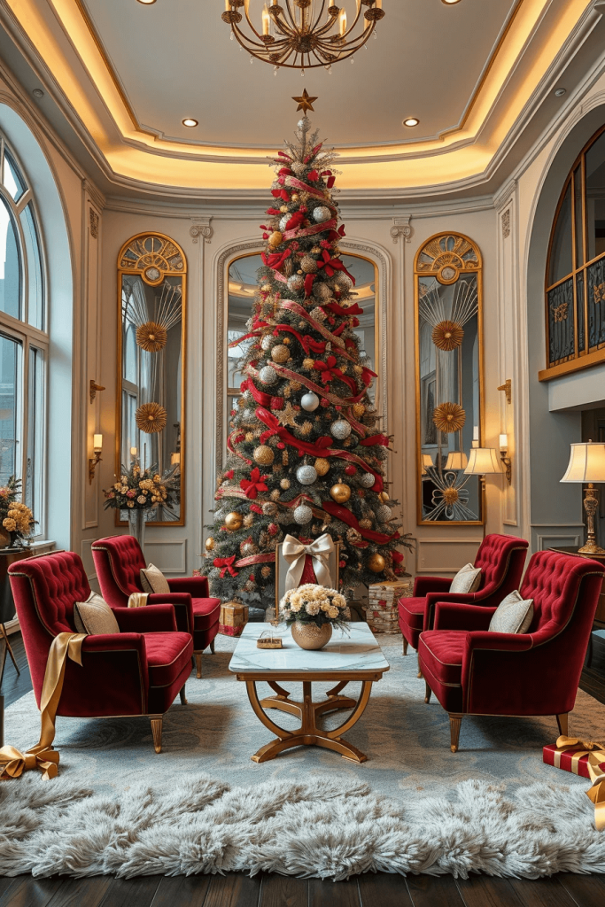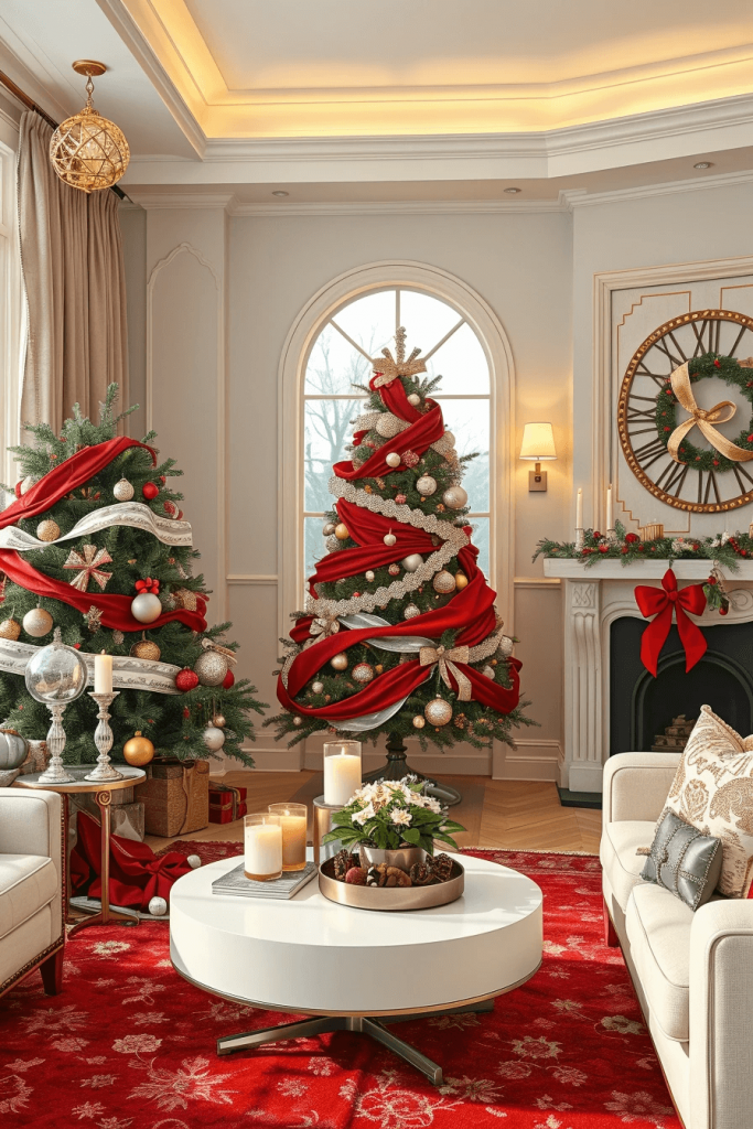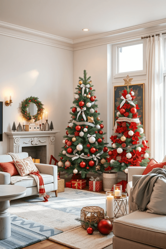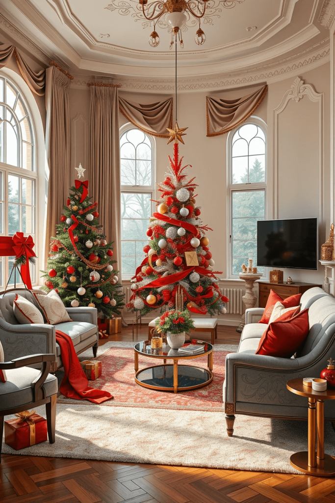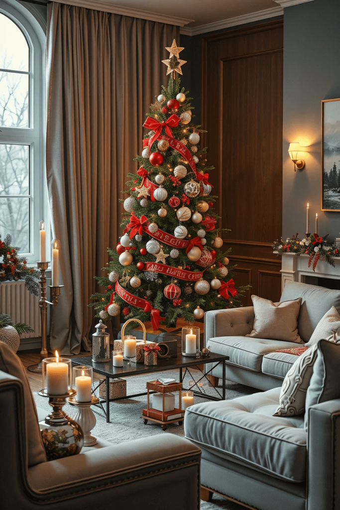 In the case of furniture, I choose neutral bases, i.e., gray or white sofas, light wooden floor, and mirrored surfaces. The accentual elements may be red throws or curtains and other elements and silver wall art or side tables may be used to balance the metallic colors of the decorations. The look is finished with a statement chandelier or modern floor lamp which reflects the shininess of the tree.