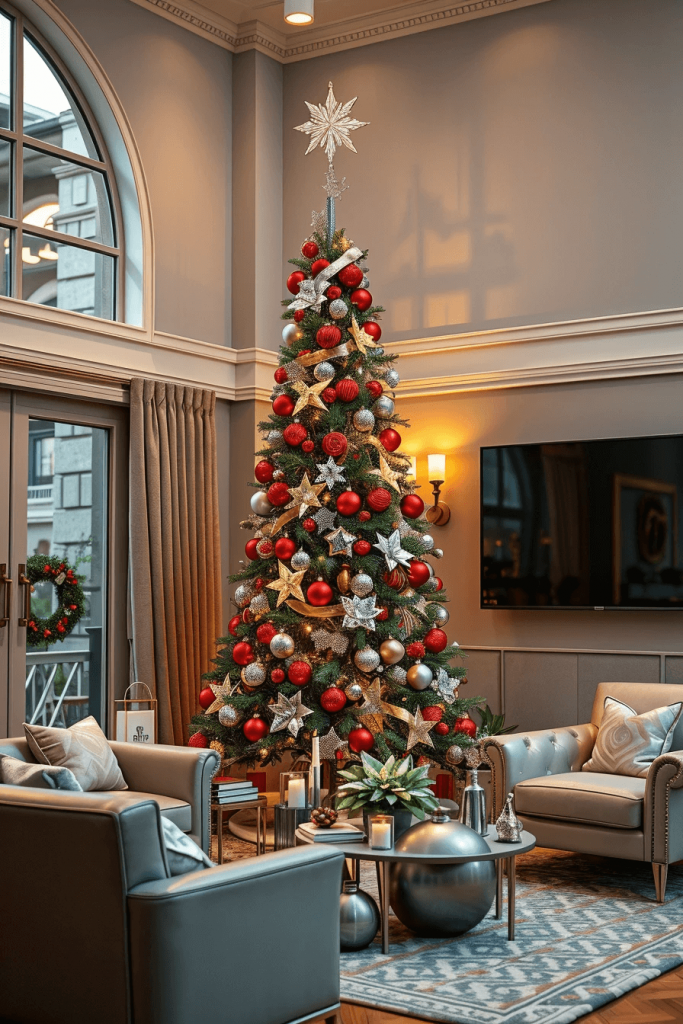 I would also suggest the use of silver vases which are stuffed with red berries or glitter branches around the tree to extend the metallic theme throughout the room.