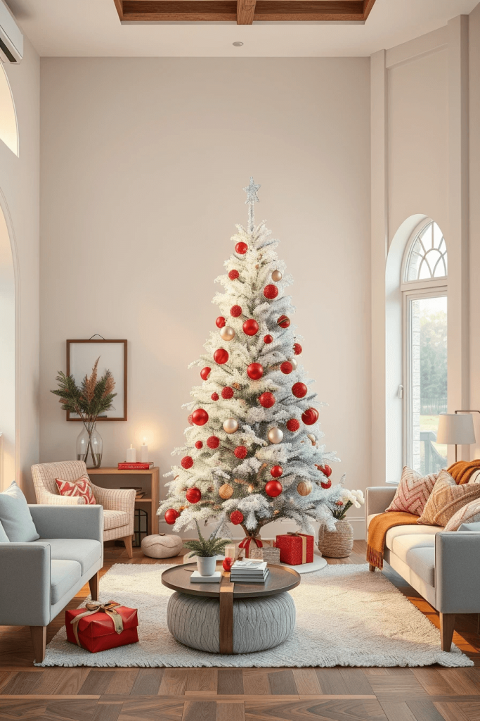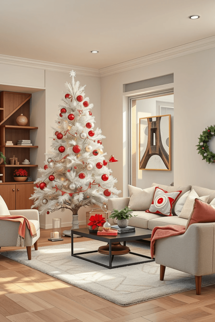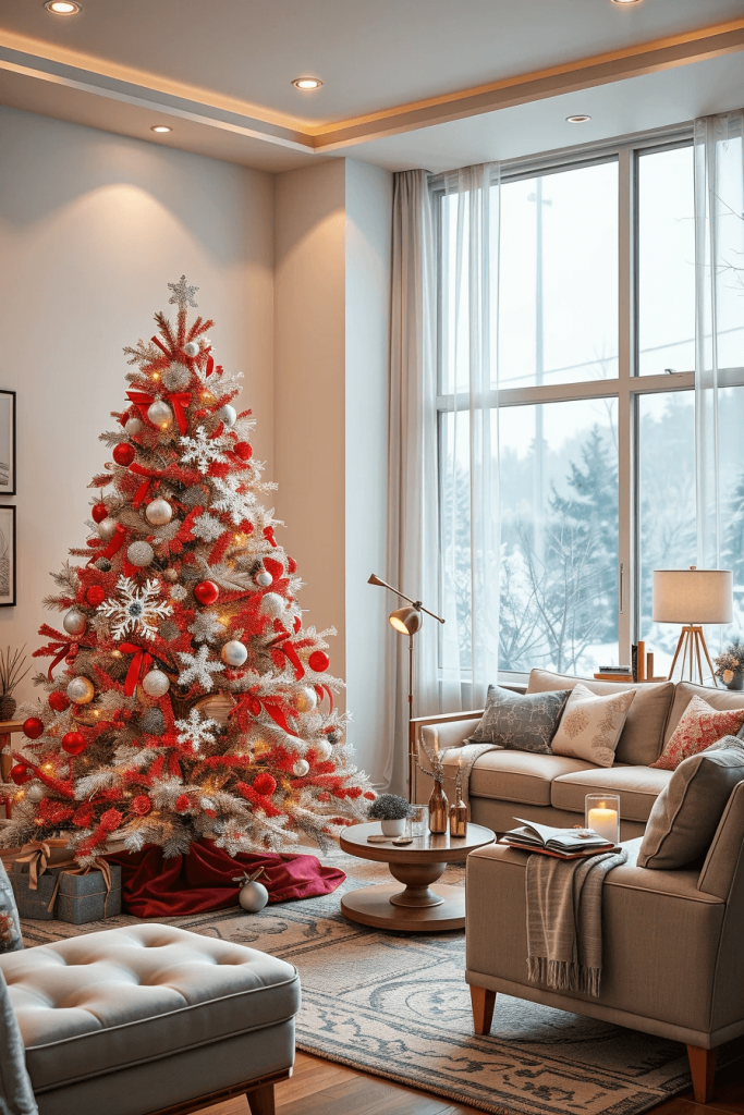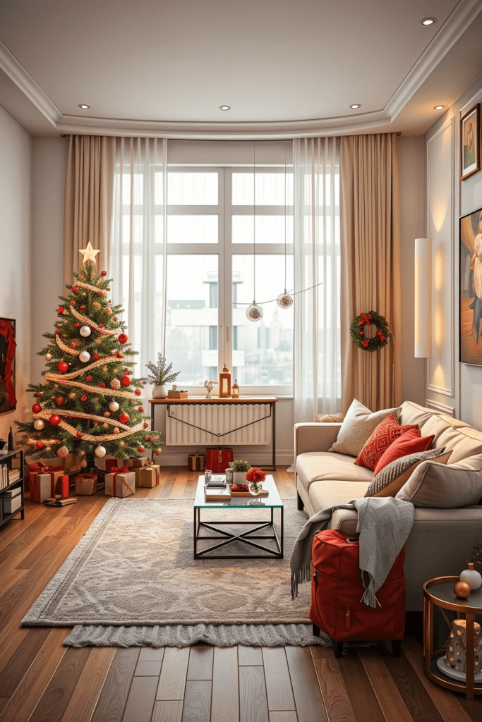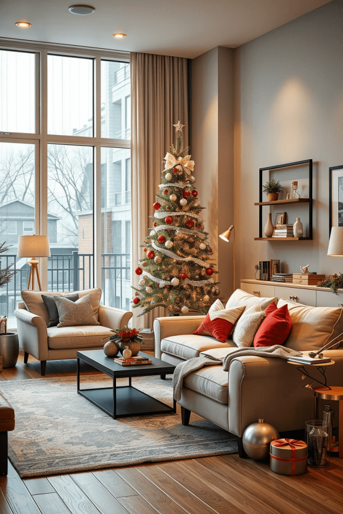 In the case I live in, I tend to balance the tree with contemporary furniture of neutral colors which could be white, gray or light beige. The look is held beautifully together with a velvet, soft cream or gray sofa, a fluffy white rug and faint metallic accents in the decor. Red throw pillows, silver candle holders, and string lights hanged on floating shelves add more warmth to the appearance of the cozy apartment without distorting a clean and modern appearance.