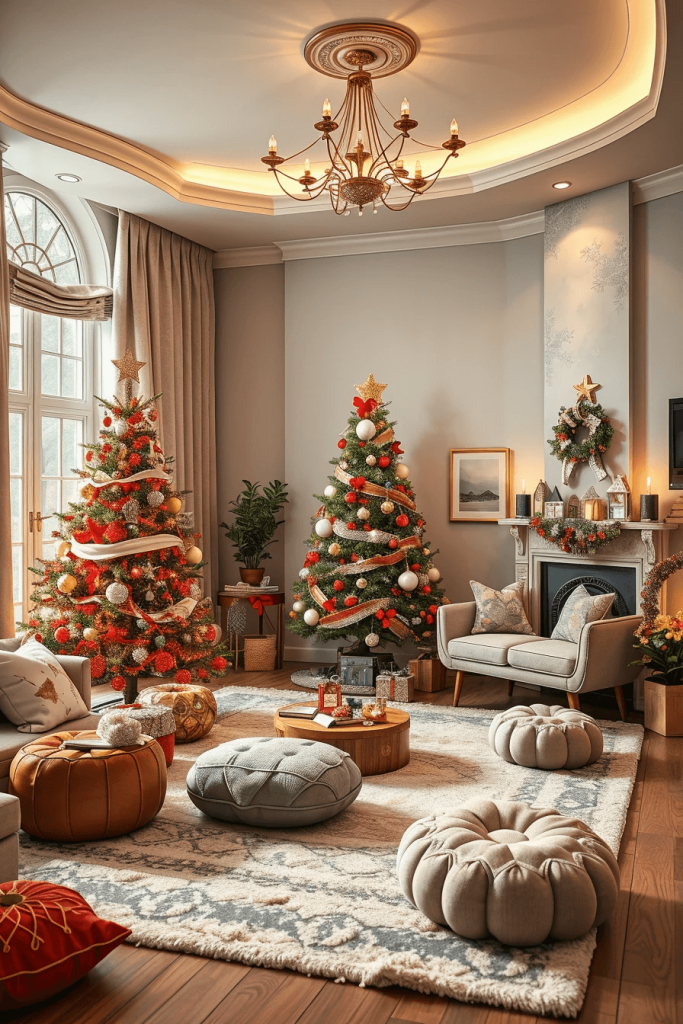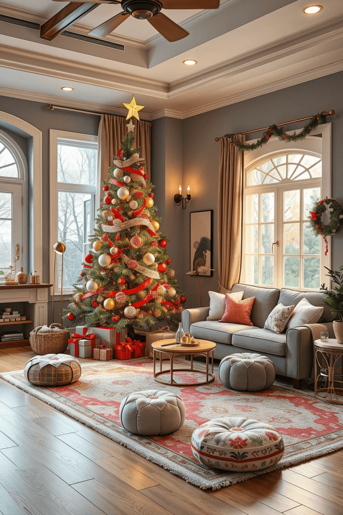 Regarding furniture, I maintain an openness of layouts and child-friendly environment. The size of the rug under the tree is large and soft, therefore, comfortable and safe. I prefer to have a low coffee table around which the silver candles or pictures of the family in red frames adorned with red decorations. The introduction of the small seating poufs creates their own small area and preserves the classy feel of the decor.