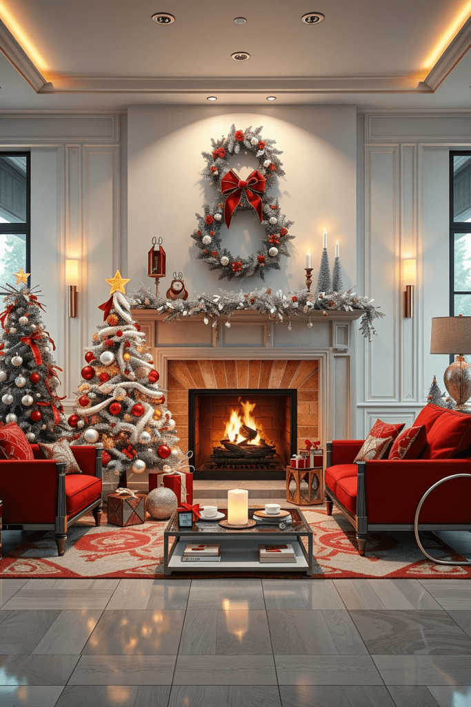 A living room that is festive is made in a way that is centered on red and silver decor, which makes it feel vibrant and contemporary. I would always begin with Christmas tree as the center of attention and then add accents to the room. Silver candelabras, red velvet cushions and metallic vases are some of the pieces of equipment that bond the theme. The outcome is a balanced combination of color and texture which is smooth but welcoming.