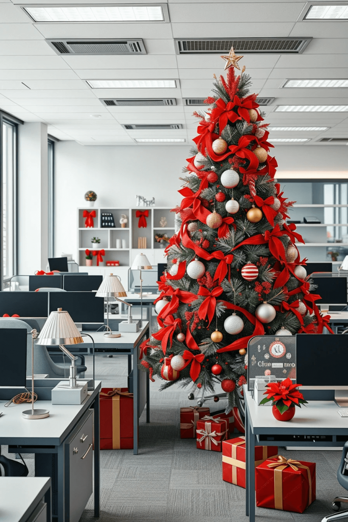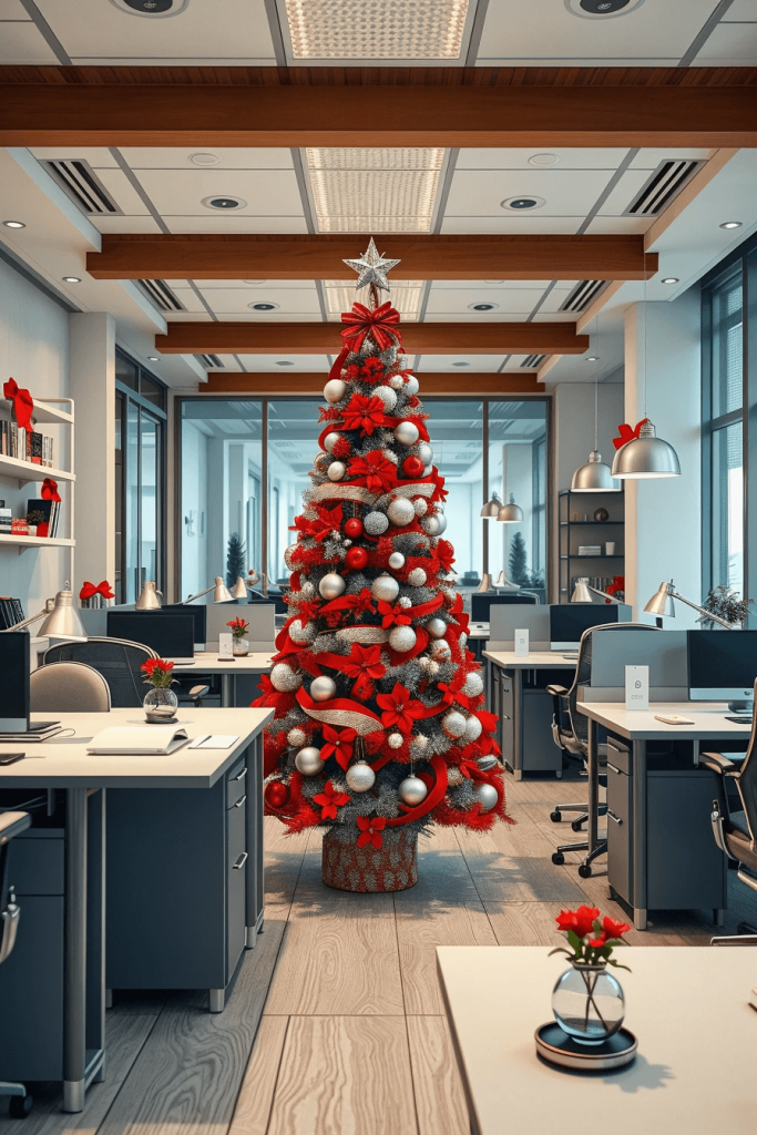 Placing a red and silver Christmas tree in an office gives an immediate cheer to the office and still gives a professional appearance to the office. My tree is smooth, artificial and of small size, which fits corners or reception rooms. Silver decorations, red bows, and few lighting elements make the design elegant and business casual. The mixture of helias and warm sounds is also festive but not overwhelming the workspace.