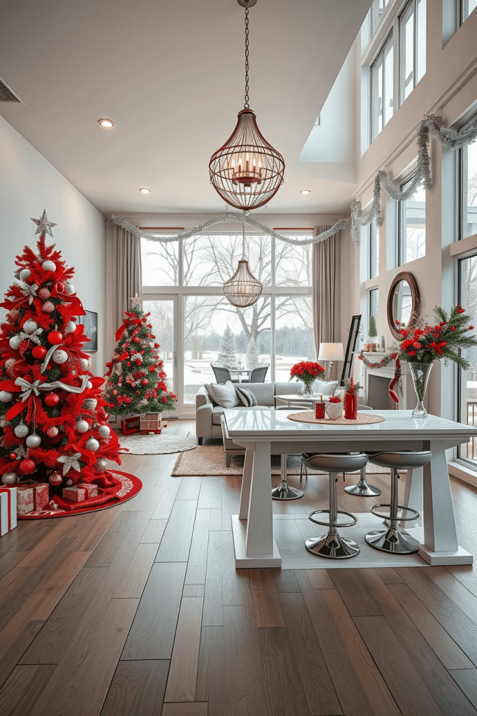 In designing open-plan homes, I would consider the red and silver Christmas tree to serve as a common element that would help visually merge the kitchen, the dining and living areas. A narrow tall tree would suit best in keeping the flow. I use red glass ornaments and metallic garlands, which are pleasant and do not clutter the space. The silver assists in bouncing natural light to increase spaciousness.