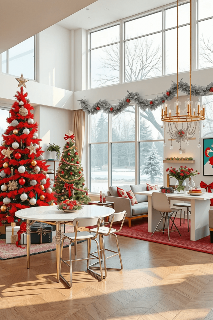 I combine contemporary furniture such as white lacquer dining tables and chrome bar stools with red velvety dining chairs or placemats. These minor details bring the color scheme and flow all over the place. The rug is a neutral one, which keeps the area of the tree down without making the shiny tree surfaces too harsh. The idea is unity, in which there is a balance between each element of the open arrangement and the red and silver decor.