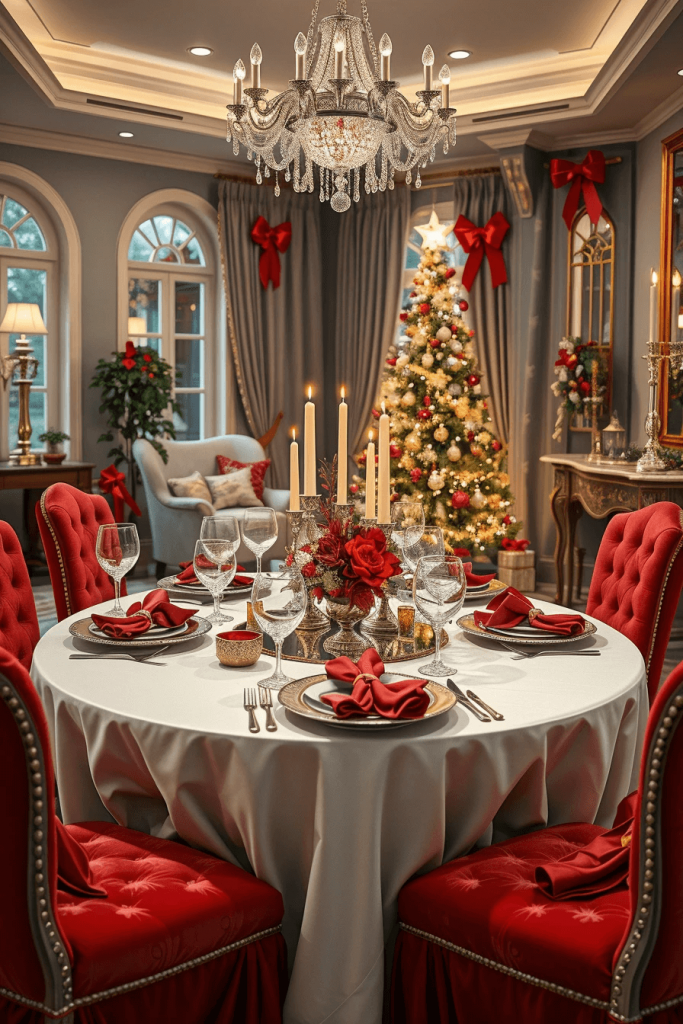 Furniture options are also important here. The appearance is improved with a sleek dining table that has chrome legs or a traditional wooden one with silver-colored accents. The upholstered chairs are light gray or deep red velvet which provides comfort and also a sense of sophistication. I also sprinkler some ornaments or red berries in the length of the table to complete the ambiance by putting a silver runner over the table.