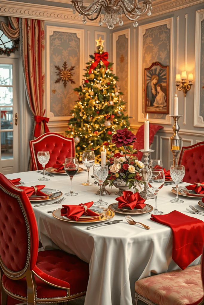 The red and silver Christmas tree should be accompanied by a holiday dining area and not competing with it. I prefer to use a white tablecloth and place silver chargers, crystal glasses and red linen napkins. The twinkling cutlery and glass is a reflection of the twinkling lights on the tree and completes the full set-up of the decor to the dining experience. It has a unified, graceful, and celebratory effect.