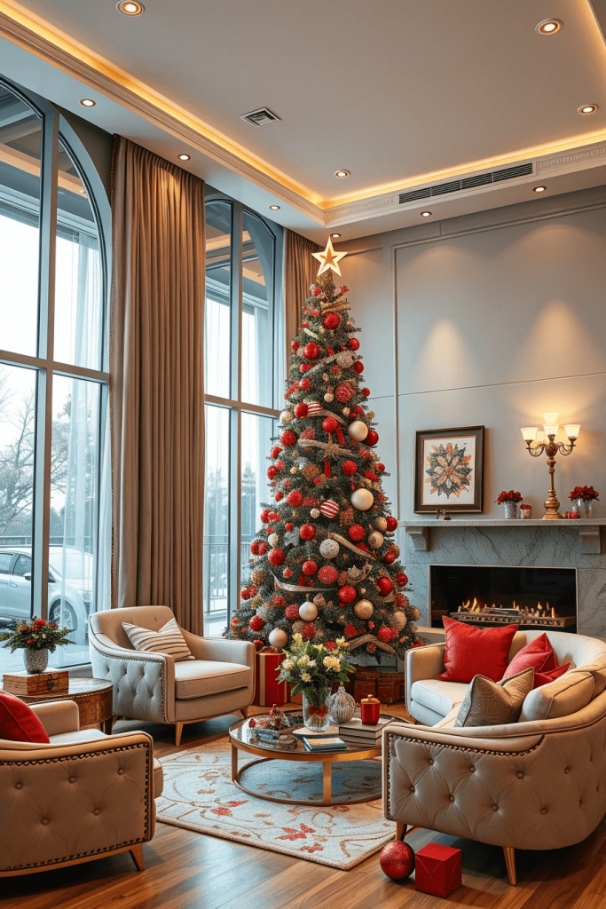In the case of furniture, I choose neutral bases, i.e., gray or white sofas, light wooden floor, and mirrored surfaces. The accentual elements may be red throws or curtains and other elements and silver wall art or side tables may be used to balance the metallic colors of the decorations. The look is finished with a statement chandelier or modern floor lamp which reflects the shininess of the tree.