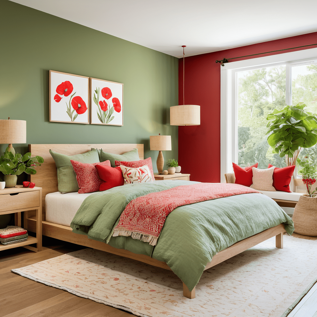 A blend of green and red in a bedroom makes for a lively and reviving atmosphere. Opt for a light green as a base tone for the walls or bedding and introduce red through small items like throw pillows, rugs, or curtains. This combo of colors surely brings out a natural and organic aura of a room like a garden or outdoor venue. Wooden furniture or soft texture fibers can be of help here, as these materials will give the bedroom a peaceful retreat feeling. This design will attract those who desire a visually serene and nature-connected place.