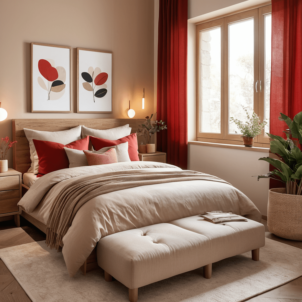 Red Accents Invigorated by Earthy Tones in a Cozy Bedroom