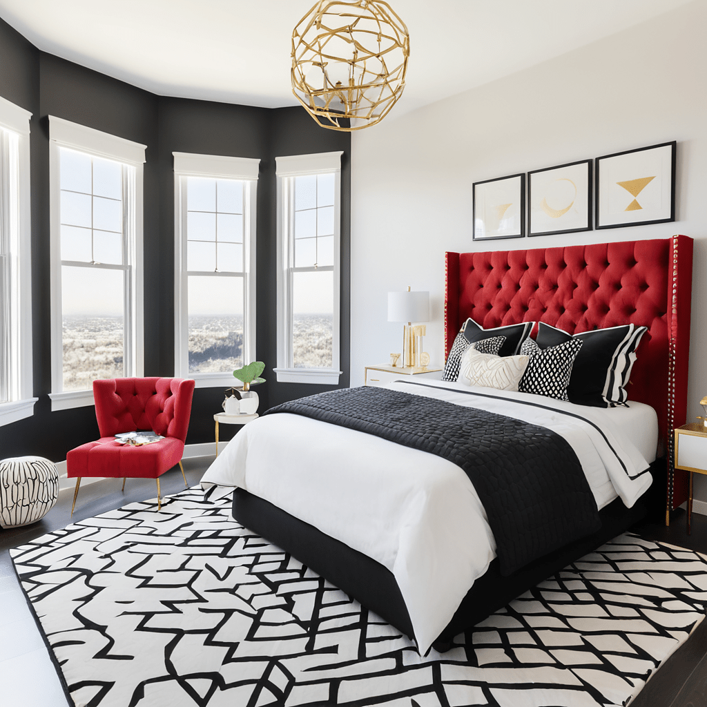 The fusion of black and white with a dash of red gives birth to a creative, classy, and modern bedroom design that is both timeless and modern. For starters, take black and white as the base color for the walls, furniture, and bedding, and let the red pops be spiced up with the addition of accessories such as a throw pillow or two, lampshades, or wall art. Clean white linens and a black bed frame create a monochrome background, while a red curtain or a rug adds warmth and depth. This balanced approach allows the red accents to pop out but still be part of the space, thus, making it perfect for those who are looking for luxurious yet very bold interior settings.