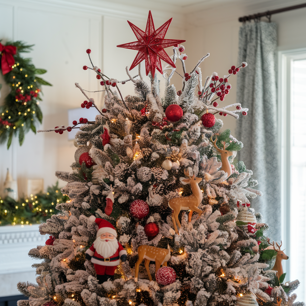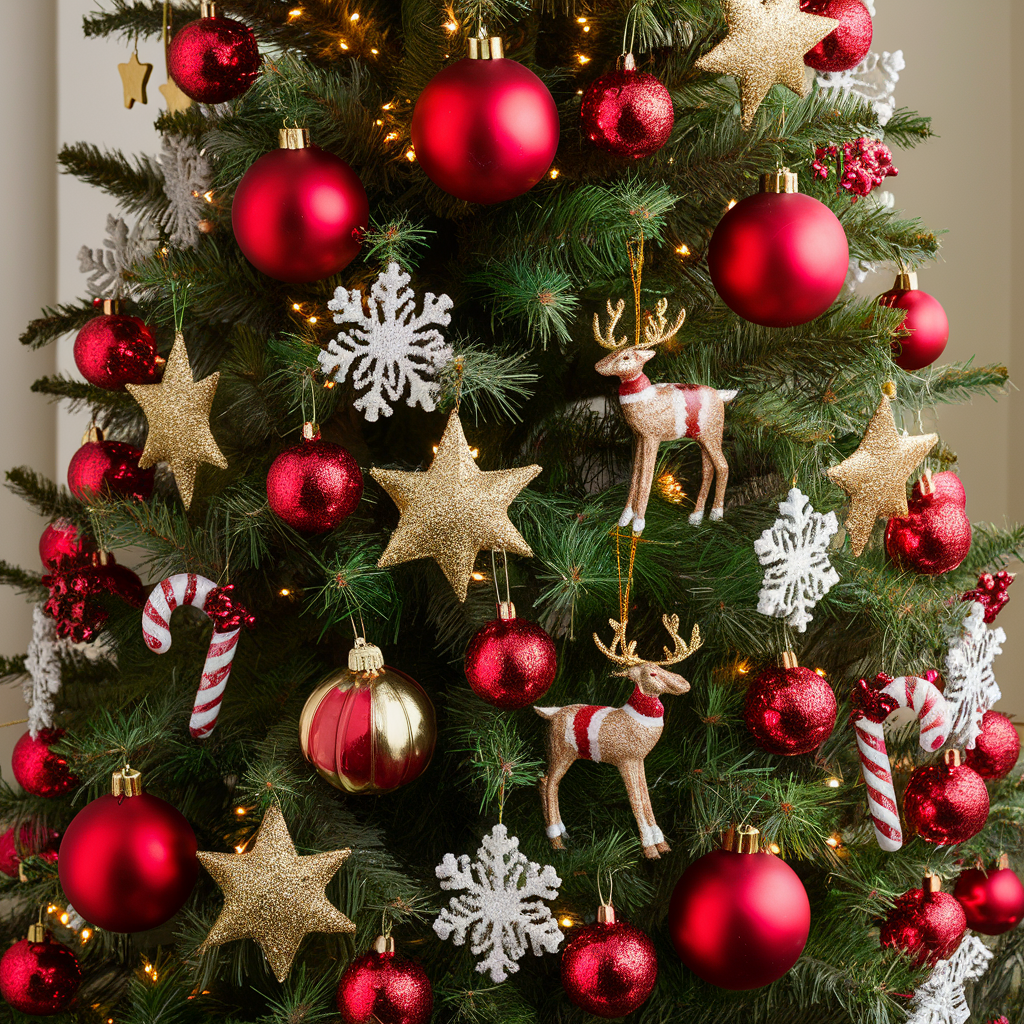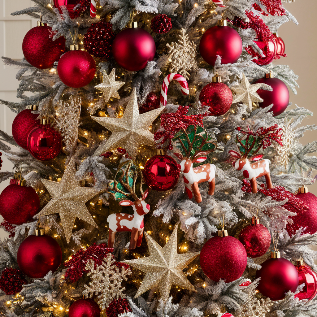It is the selection of the perfect red Christmas tree ornaments that sets the right mood in the whole living room. Try a range of red baubles, golden stars, and white snowflakes to achieve that balanced and festive look. You may include unique ornaments in the shape of reindeer (red and brown colored) as well as candy canes (combinations of red and green) for variety. Make use of the interplay between different textures and finishes, such as matte, glossy, and glitter, to achieve a tree that is both invitingly picturesque and perfectly synchronized with your living room aesthetics.