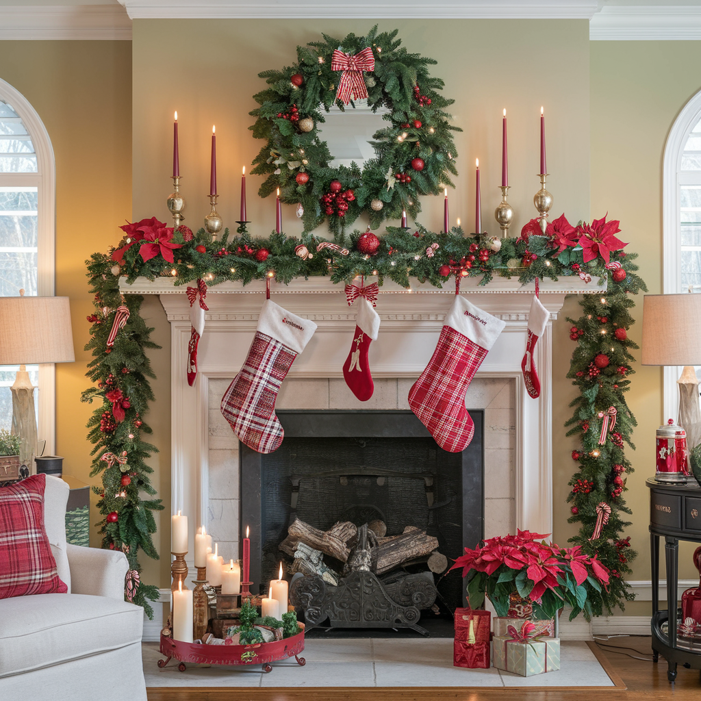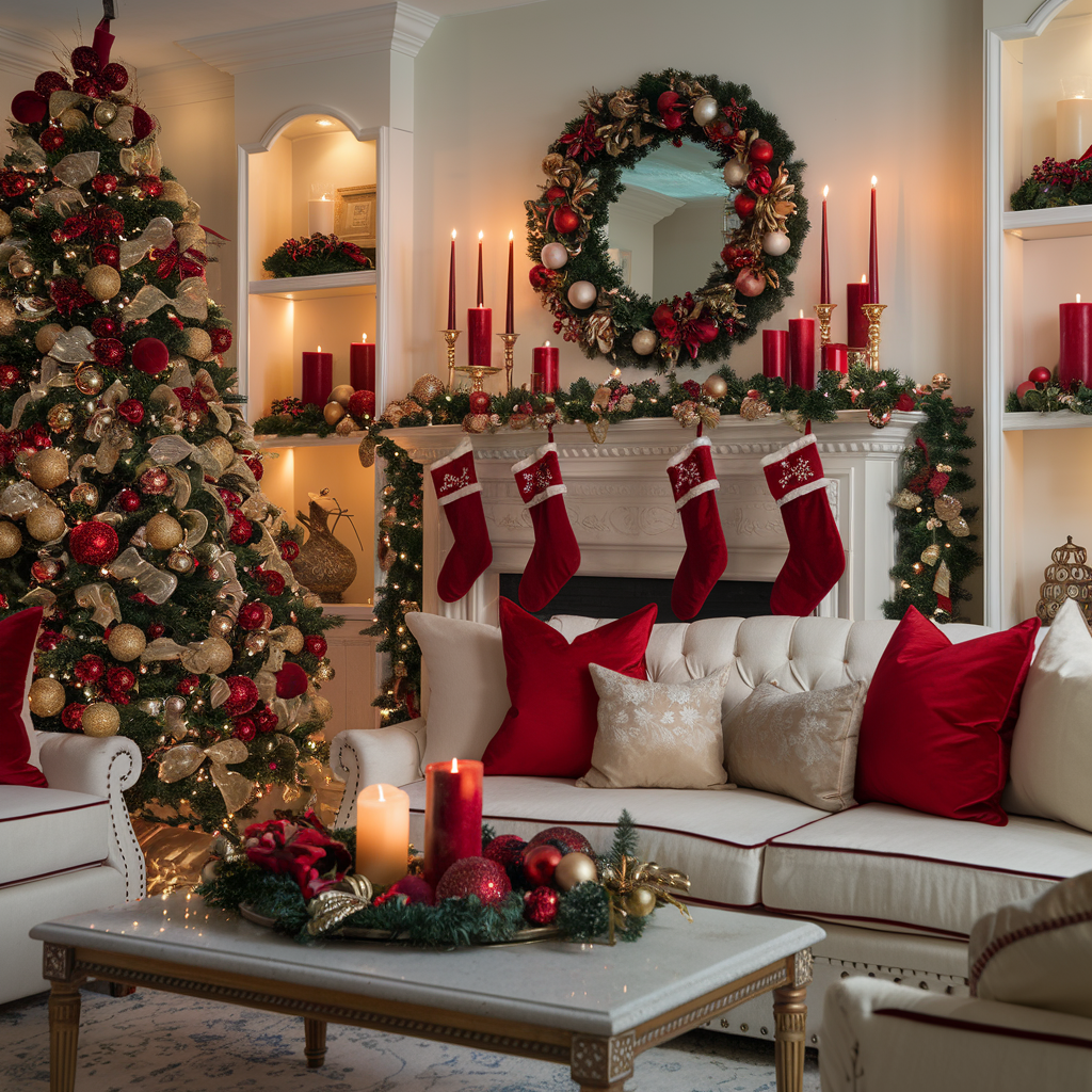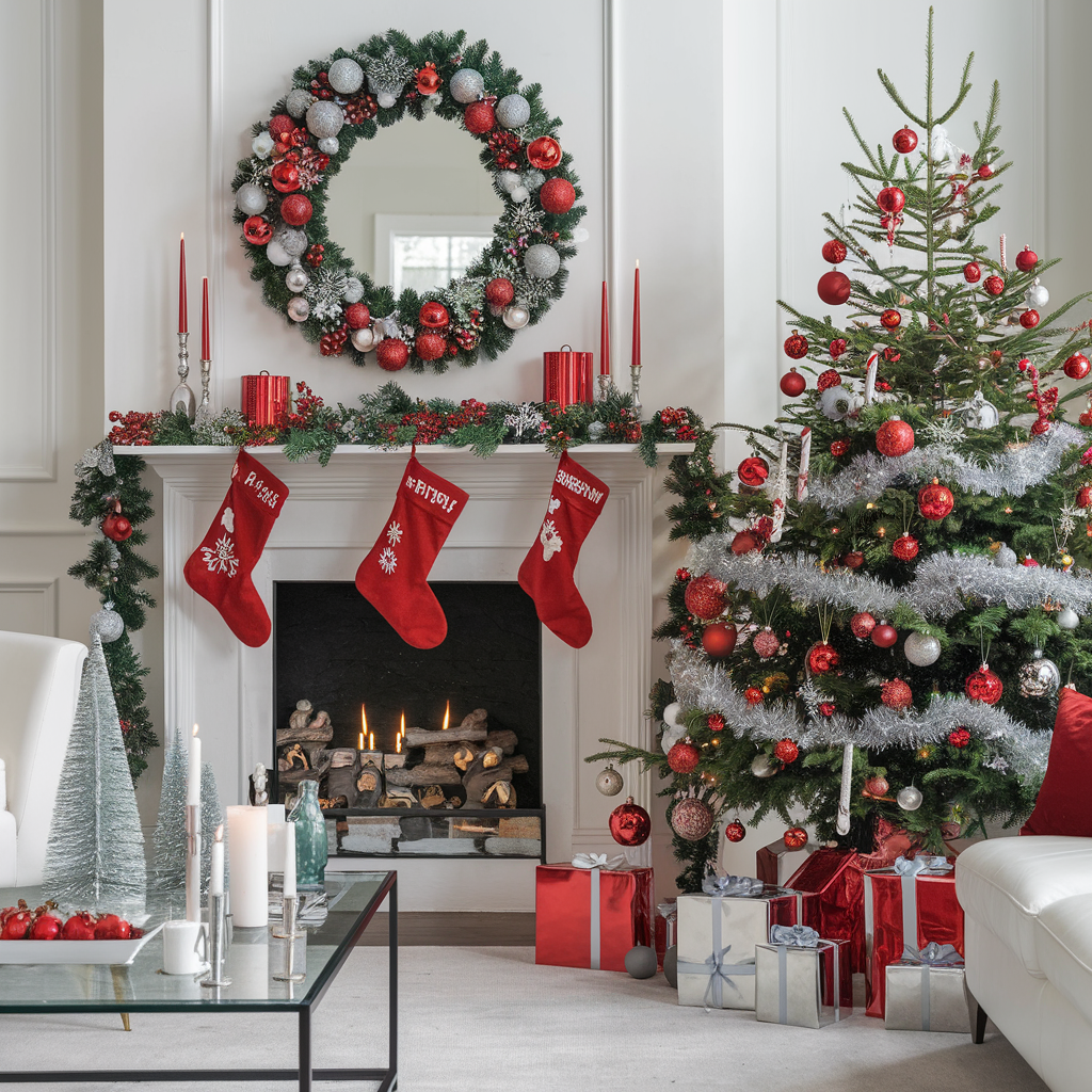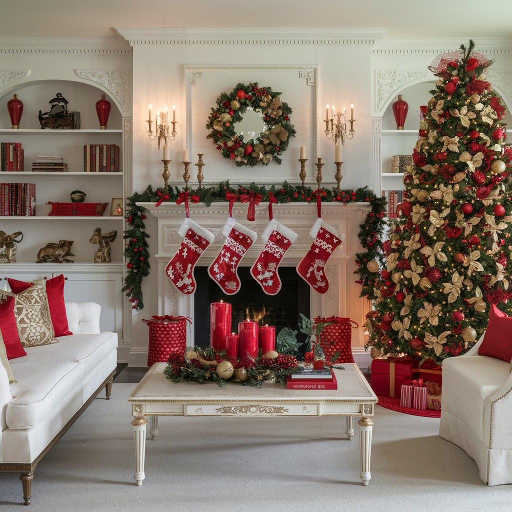 Your mantel is the focal point of your living room during the holiday season, and designing a red Christmas mantel display can make a bold statement. Buzz it on with the chimney broomstick-place green garlands beneath, then add maroon Christmas condemners, candles, and stockings- to make it look uniform. Moreover, you might add red poinsettia, red berries, and striped fabrics of reds and whites for additional variety. The perfect combination of materials and layerings is a rich and delightful decoration that attracts immediate attention and sets the tone for your living room.