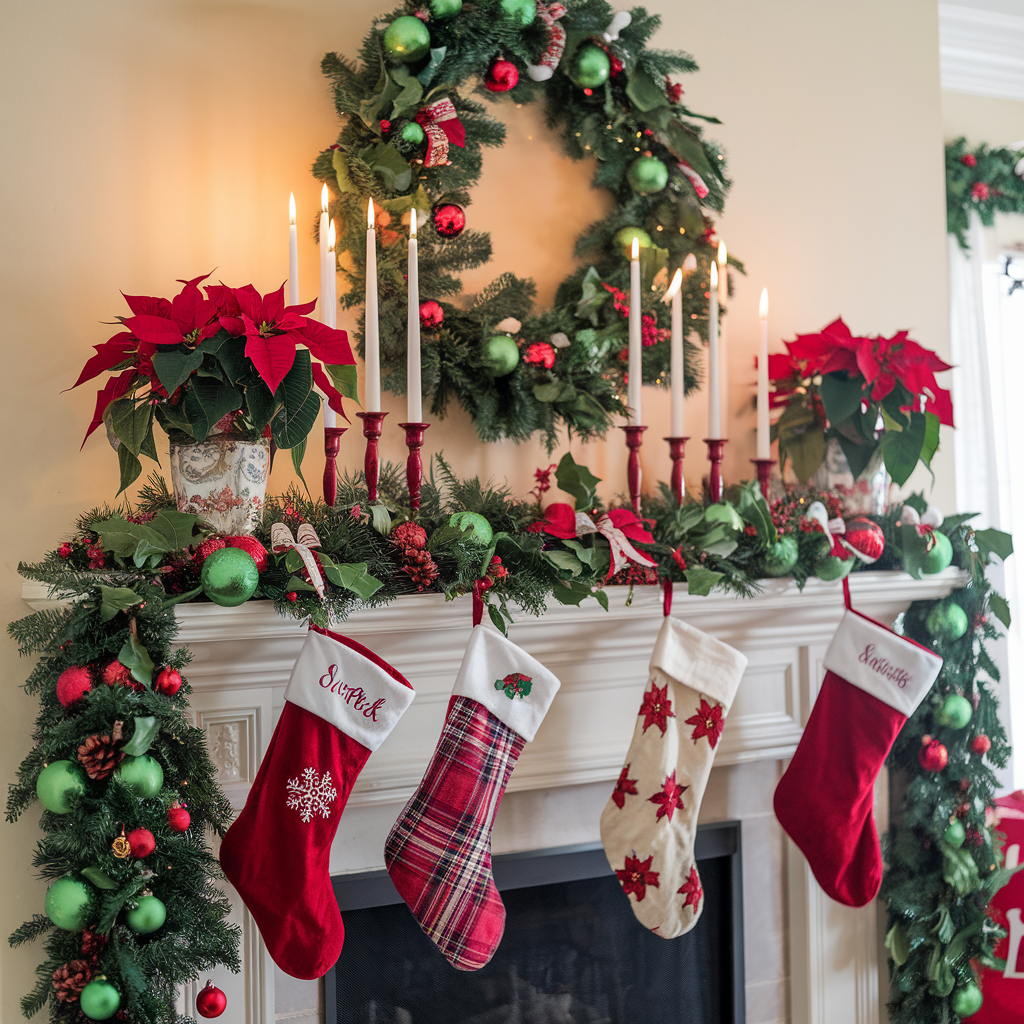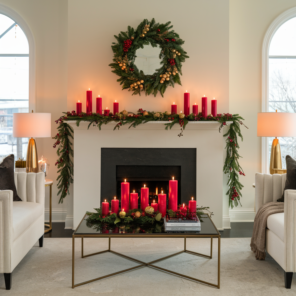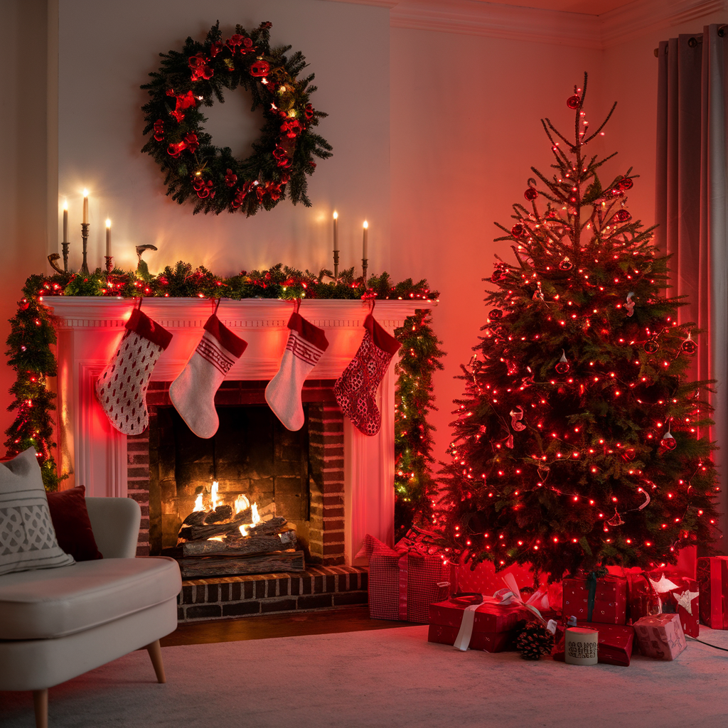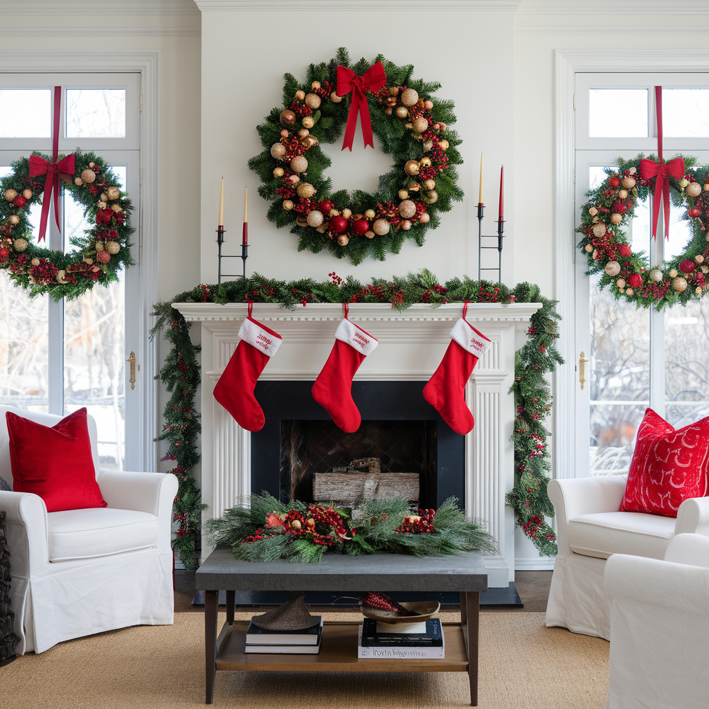 Your mantel is the focal point of your living room during the holiday season, and designing a red Christmas mantel display can make a bold statement. Buzz it on with the chimney broomstick-place green garlands beneath, then add maroon Christmas condemners, candles, and stockings- to make it look uniform. Moreover, you might add red poinsettia, red berries, and striped fabrics of reds and whites for additional variety. The perfect combination of materials and layerings is a rich and delightful decoration that attracts immediate attention and sets the tone for your living room.