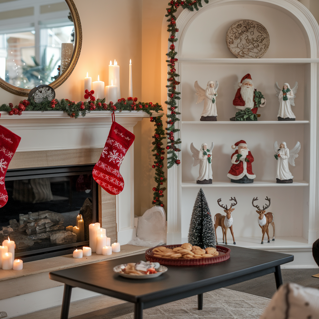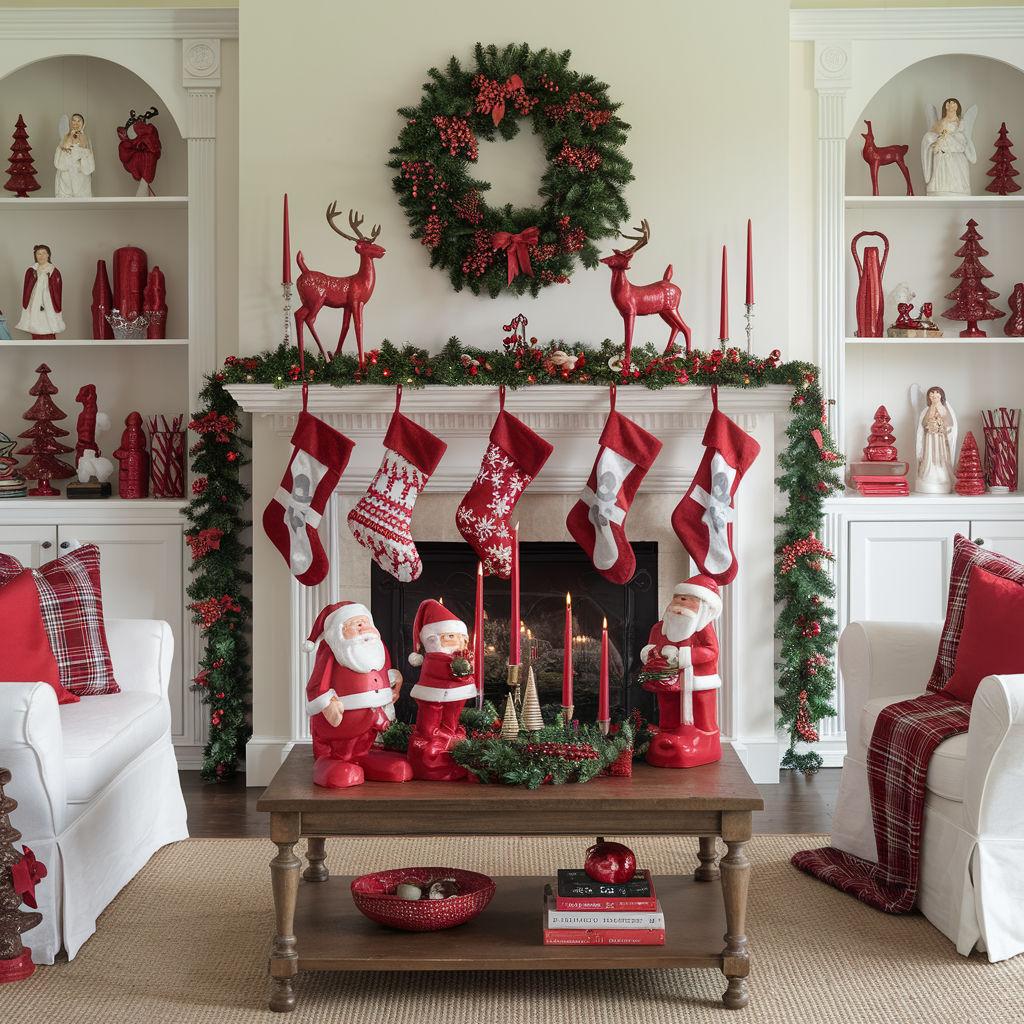 Red Christmas figurines, such as Santa Claus or reindeer, or angels, can be a good choice for adding charm to your living room. You can put these figurines on your mantel, coffee table, or display shelf to manifest the festive aura. You can combine the figurines with other red decor elements, such as garlands, candles, or stockings, to create a cohesive look. Pick your figurines in a contemporary style to fit into a stylish and fresh decor yet still retain the traditional holiday spirit.