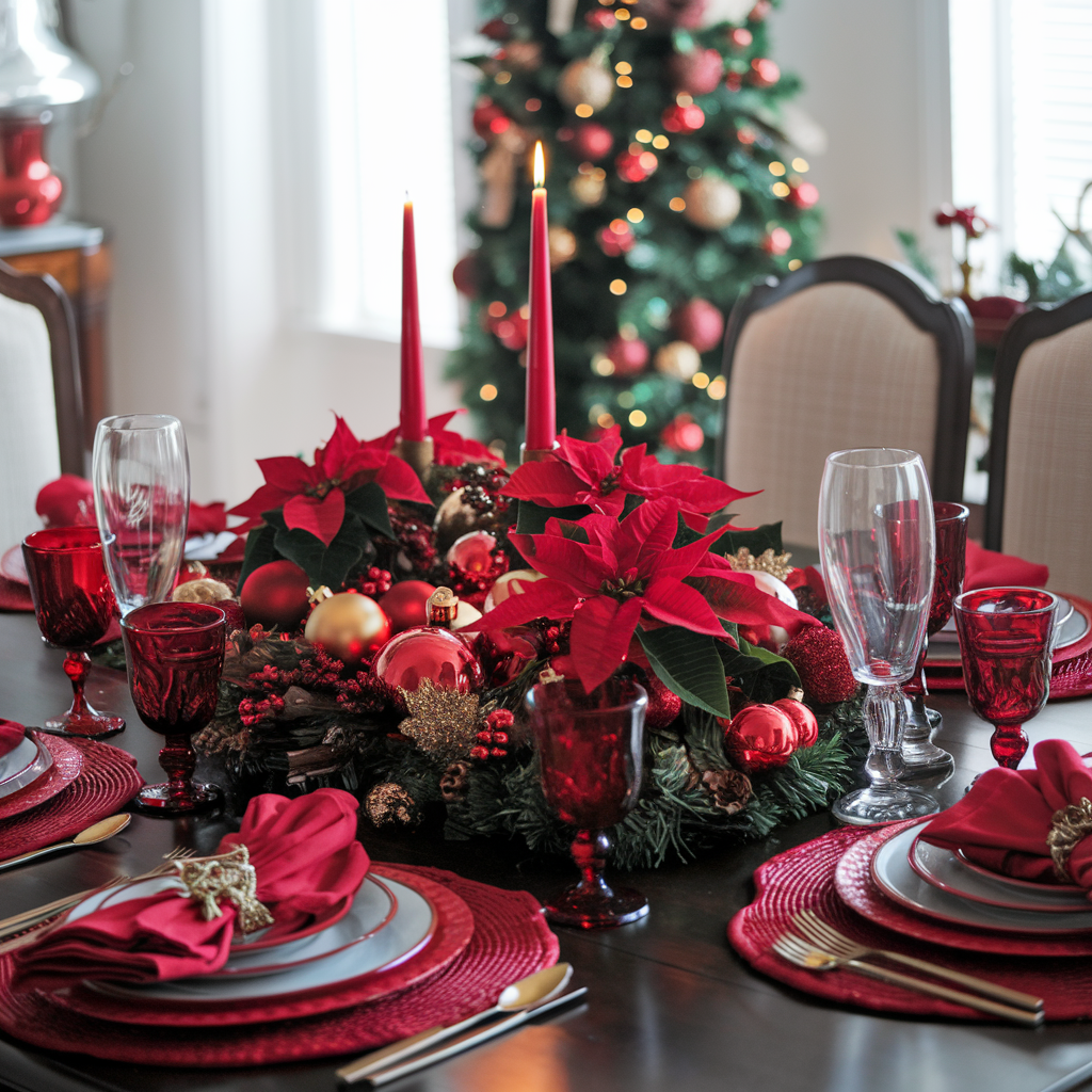 Your living room table becomes a charming site by enhancing with tasteful Red Christmas table decoration. Beautiful and charming centerpiece including red candles, poinsettia, and red Christmas and gold ornaments provide additional optional to help you complete your Christmas table decor. Please do not forget red placemats and red napkins to finish the look. This setup connects the style of your living room to the festive setting outside, at the same time offering a space for you to enjoy snacks or drinks and feel like in the festive spirit. However, the important thing is not to overwhelm the space with the brightness of the reds, thus mixing them with soft neutral colors will give here a gentle makeover.