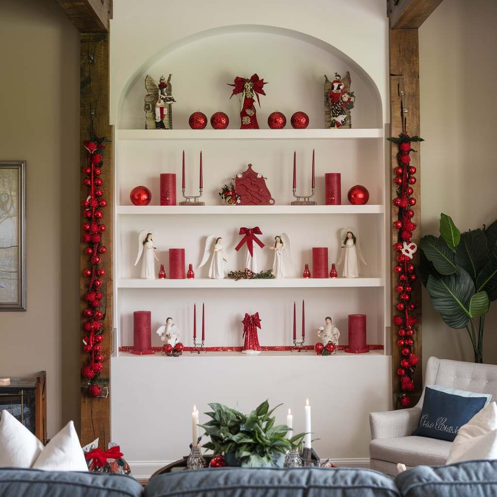 Your living room can be made more unique and festive by a red-themed Christmas display shelf. You can present red ornaments, figurines, and holi trinkets through the use of a bookcase or a shelf on the wall. Also, other red decor items such as candles, photo frames, or even small wrapped gifts can be used to decorate it. Besides decorating the whole house in holiday style, this display also permits you to present some of your favorite Christmas pieces in an elegant and modern way.
