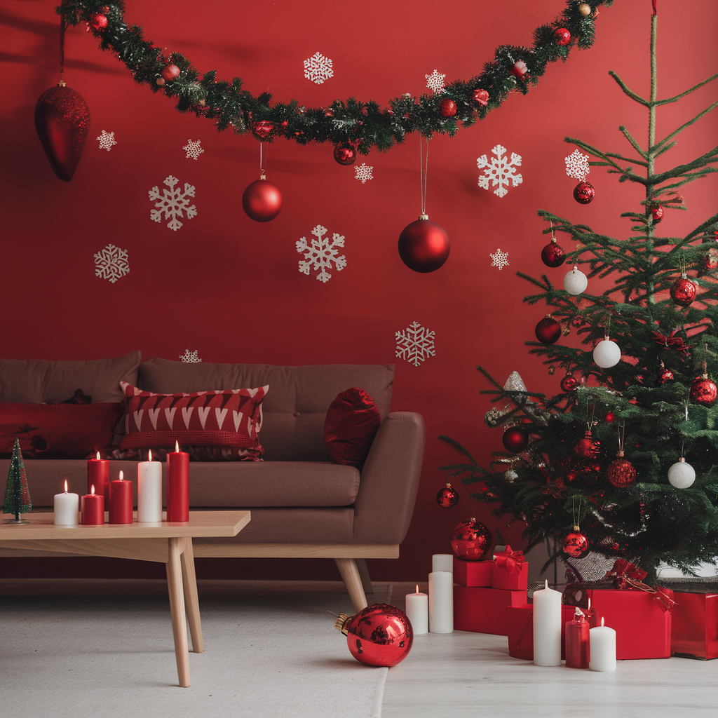 Layering different shades and textures of red in your living room decor can make it more three-dimensional and luxurious, so it will look more alive and joyful. Start off the room with a base of red objects like throws, pillows, and curtains and build layers of red items like balls, swags, and candles. The combination of different tones, from deep burgundy to bright cherry red, and the use of different materials, makes it possible to achieve a visually striking and aesthetically pleasing Christmas living room that radiates warmth and joy.