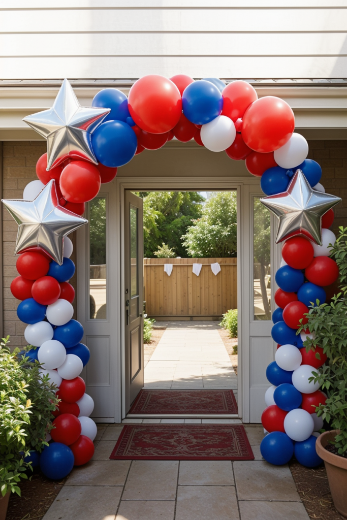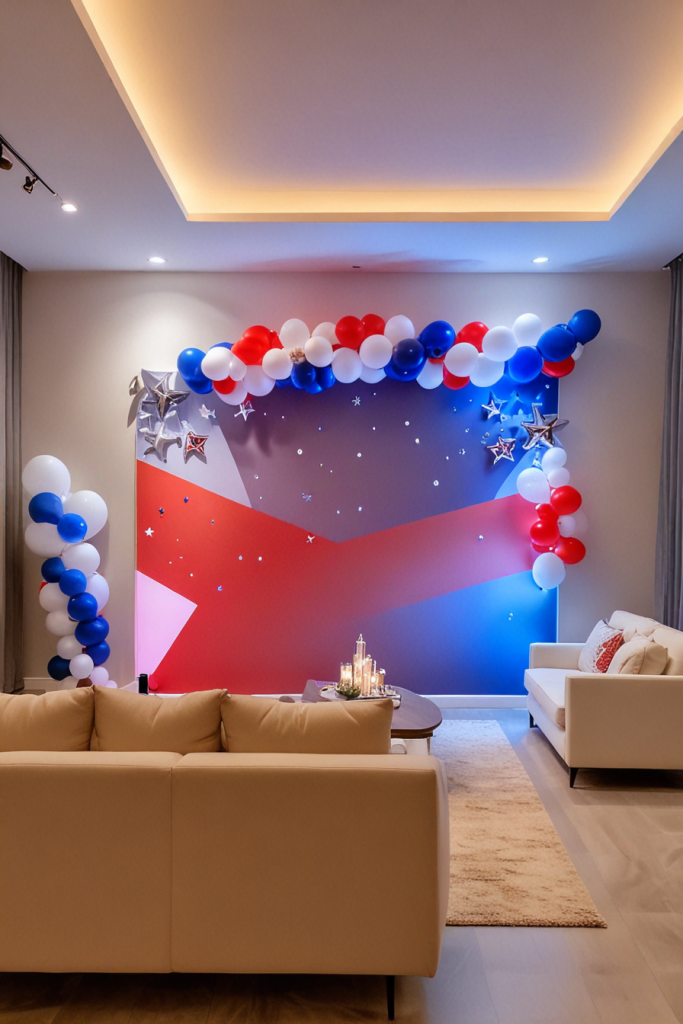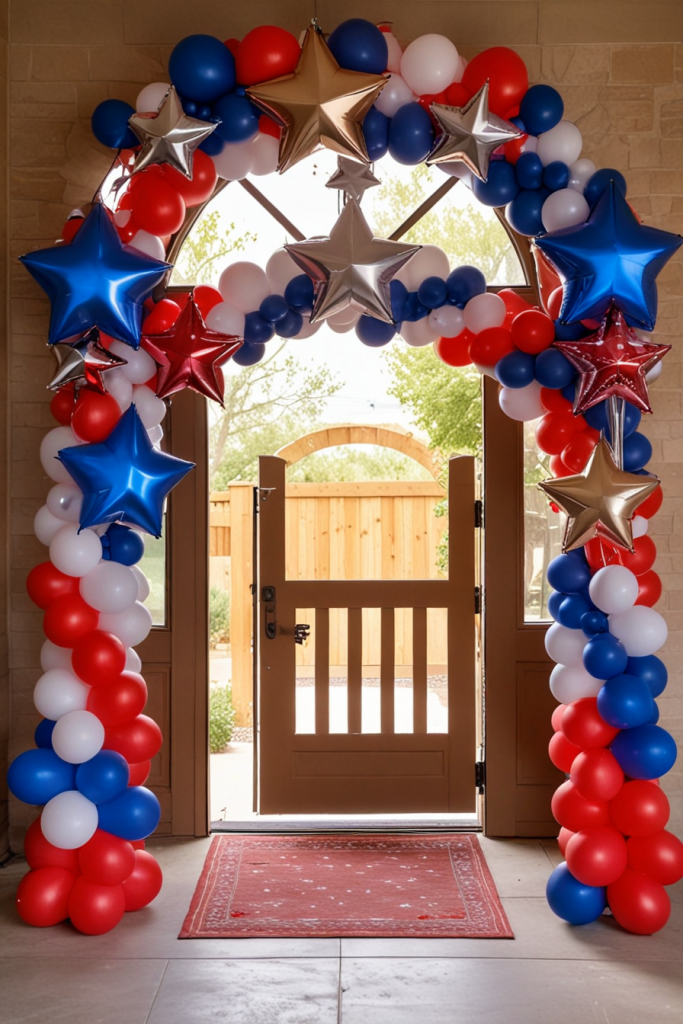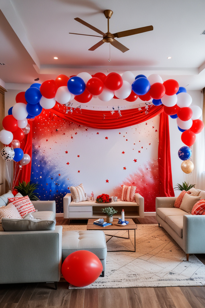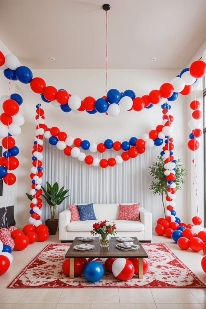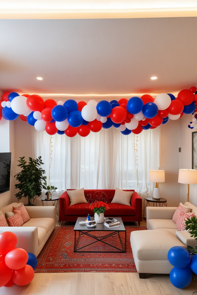 Add festive flair to your celebration by incorporating large balloon clusters in classic patriotic colors. Eggs, spheres, and ribbons mixed with balloons of various heights should be arranged around doorways, stairs, or near food stations to enhance entryways adorned with both matte and metallic balloons. Simply using balloon garlands offers bright and cheerful appeal while not requiring too many additional decorations.