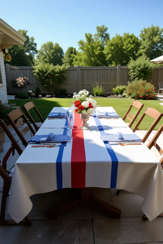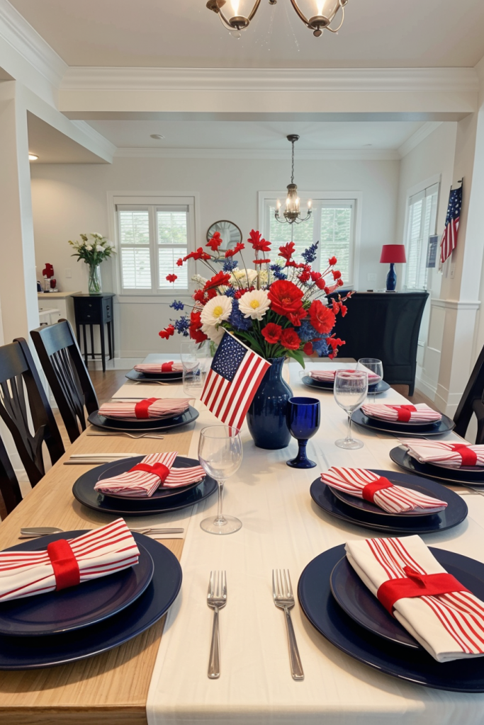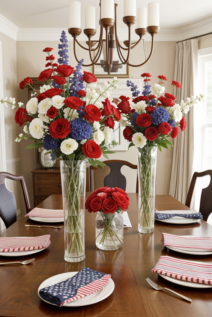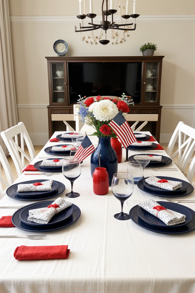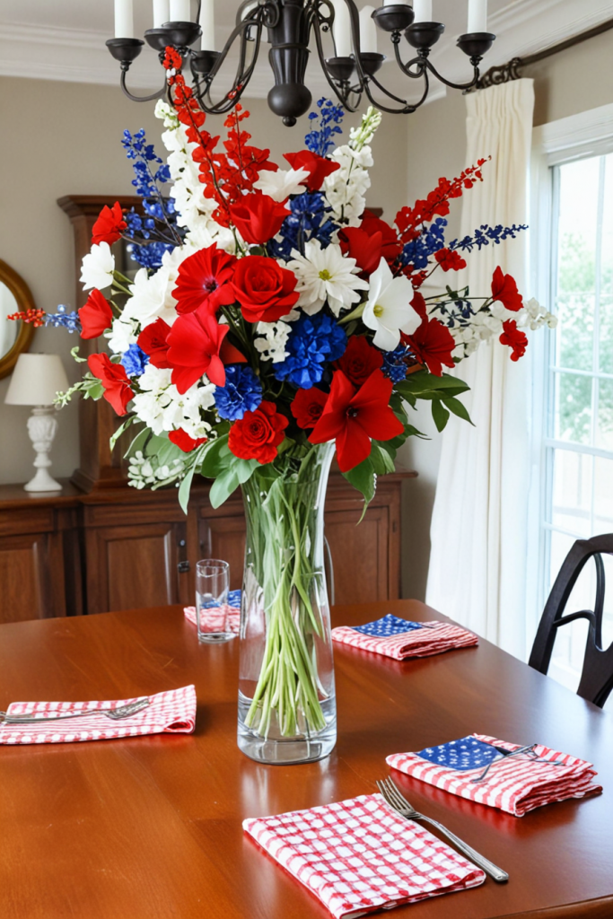 You can set your table for Independence Day with layered elements: a crisp white tablecloth, navy blue chargers, red napkins tied with mini flags or ribbon. Incorporate star-themed glassware and a basic blue vase filled with flowers for a touch of elegance. The flowers are appropriate for an outdoor brunch or casual dinner celebration.