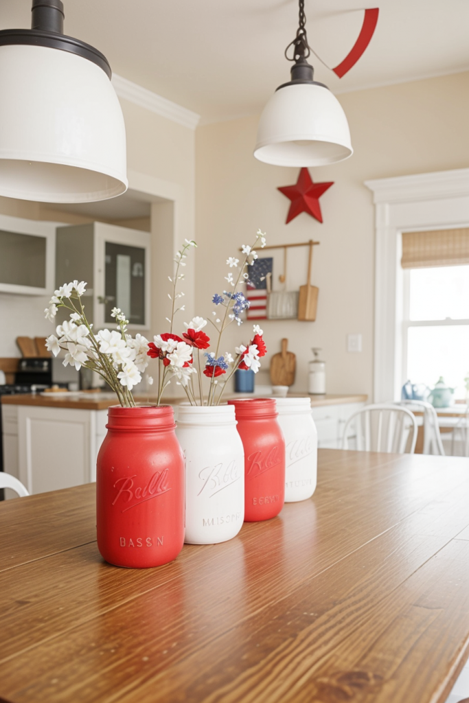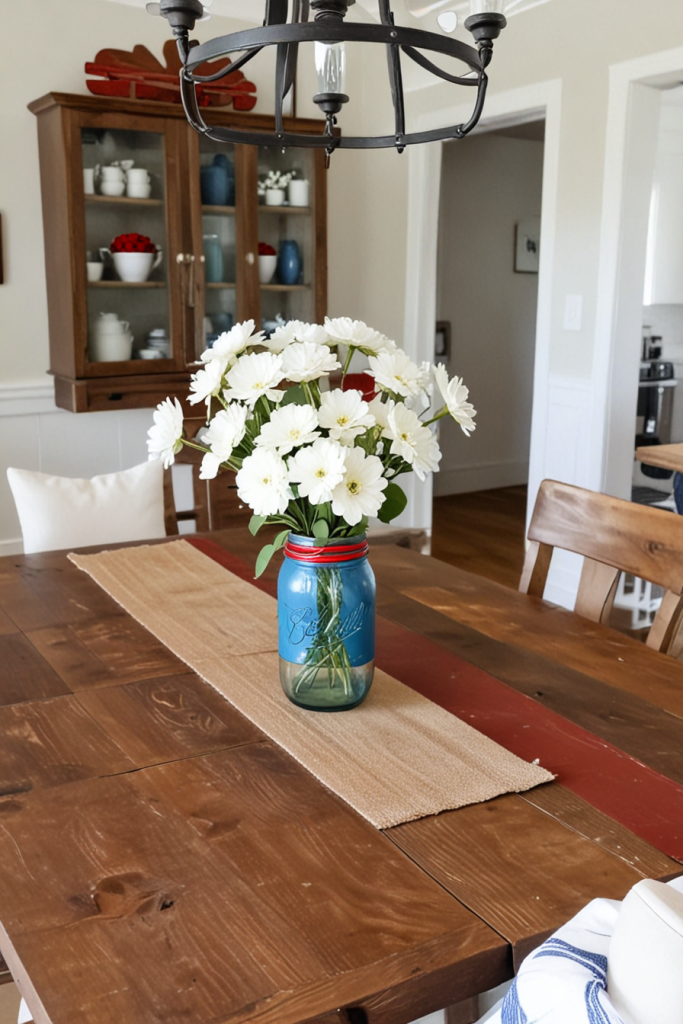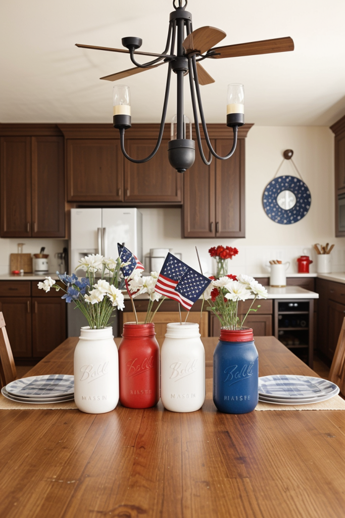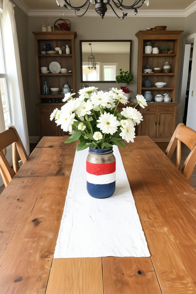 Make a DIY centerpiece for holidays with painted mason jars filled with DIY white flowers or pinwheels. Use red, white, and blue paint for the jars. For a rustic touch, place the jars on a wooden tray. For elegance, use a mirrored plate. Such DIY Decoration is perfect for adding a personal touch to your holiday decor.