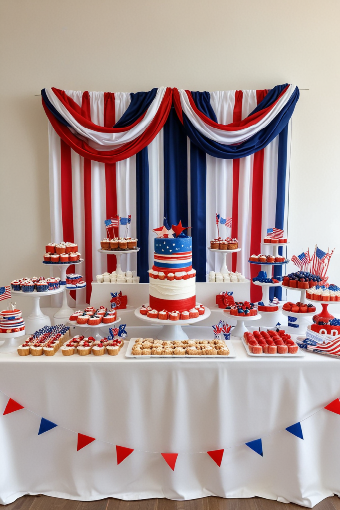 Use tiered stands, festive trays, and patriotic signage to transform your dessert display into a centerpiece. Decorate cupcakes with mini flags, use clear jars for red licorice or blue candies, and place a star-spangled cake as the centerpiece. To beautifully tie the whole table together, surround everything with bunting or a backdrop.