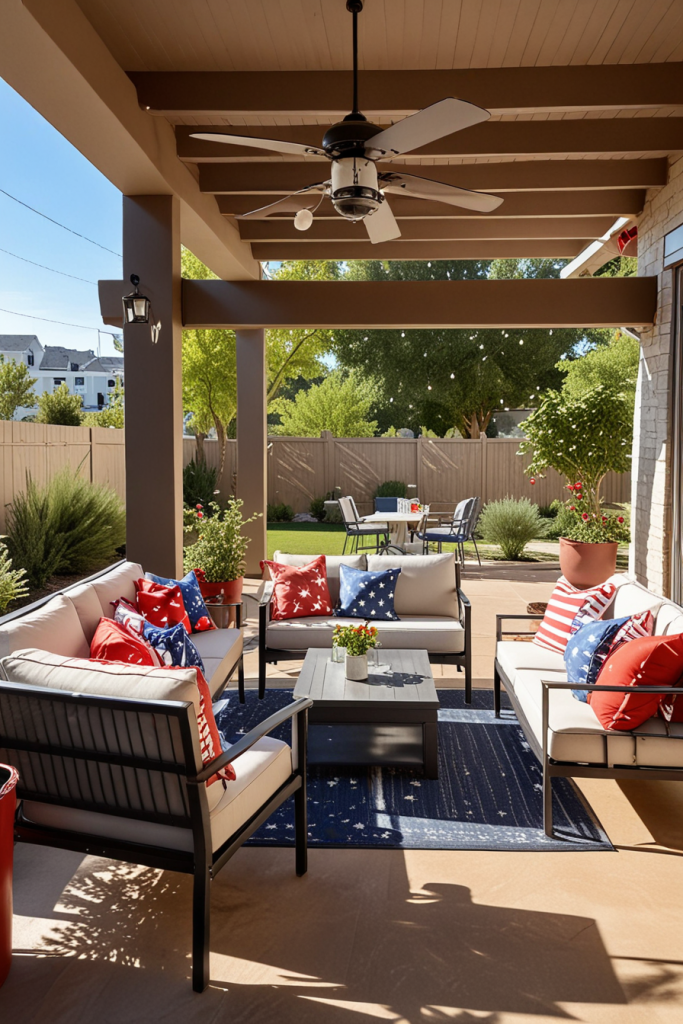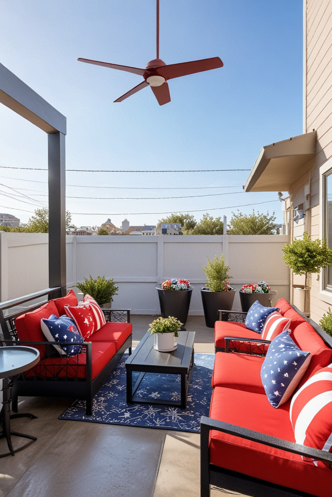 Enhance your outdoor space with star-patterned cushions, a striped throw, and a few red, white, and blue ceramic planters. Regardless of whether you have a balcony or a big patio, change the accessories to make the furniture festive yet sophisticated and cozy.