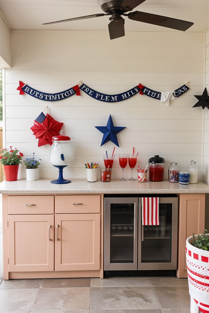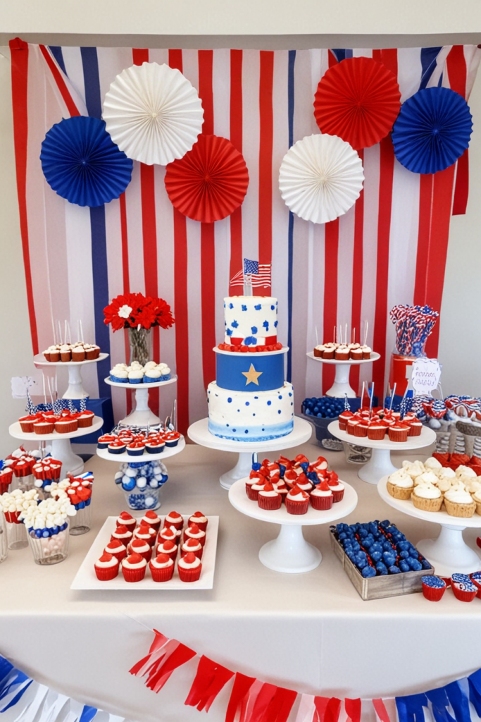 Create a stunning backdrop with streamers, fabric, balloons, or paper fans in patriotic colors. It can be enhanced with star cutouts and “Happy 4th” metallic banners. Set it up behind the dessert table or use it as a photo booth wall with props such as Uncle Sam hats and sparkler wands. This not only makes the celebration feel special, but also Instaworthy.