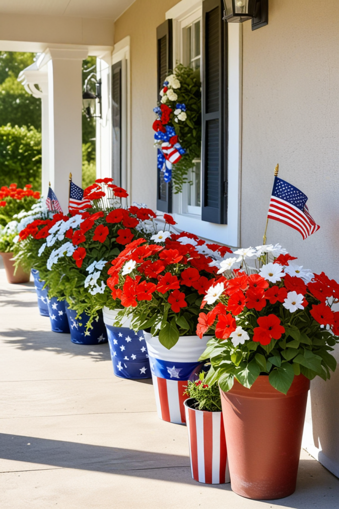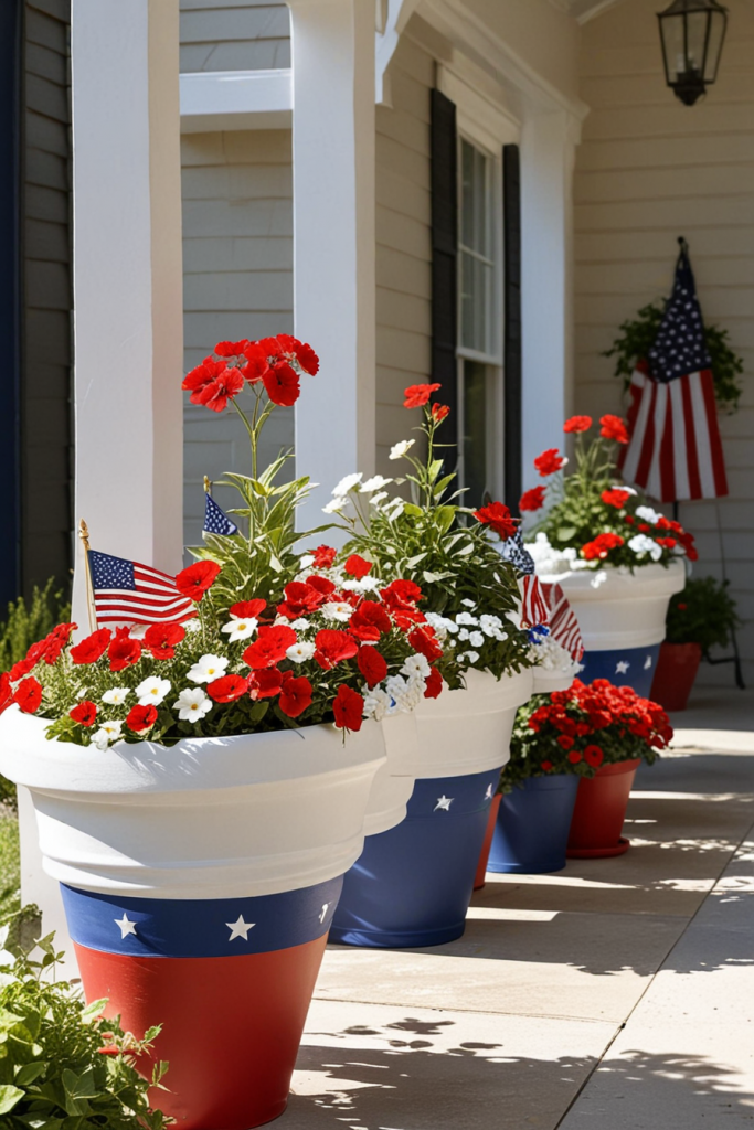 You can decorate your outdoor planters by painting the pots in the colors of the American flag, or covering them with ribbons and burlap. Accompanying flowers such as red geraniums, white petunias, and blue salvia are great additions. These changes not only beautify your garden or porch, but also serve as decorations supporting the 4th of July.