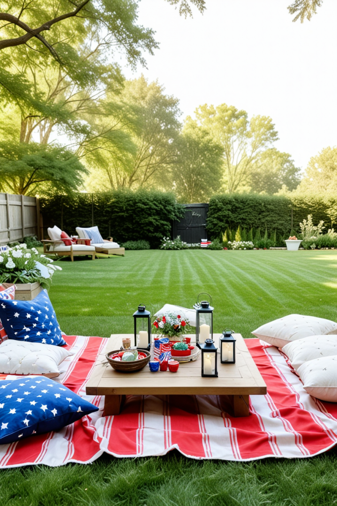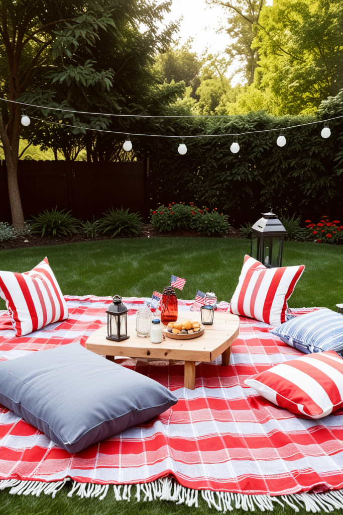 Create a stencil-style picnic using a large checkered outdoor blanket or large picnic blanket to turn your backyard into a patriotic paradise. Arrange cushions and poufs in red, white, and blue to match together with a low coffee table or wooden crates. Vintage lanterns and mason jars filled with lemonade, berries, or other summer fruits add to the nostalgic charm. This approach feels relaxed and down-home — perfect for afternoon barbecues and watching fireworks in the evening.